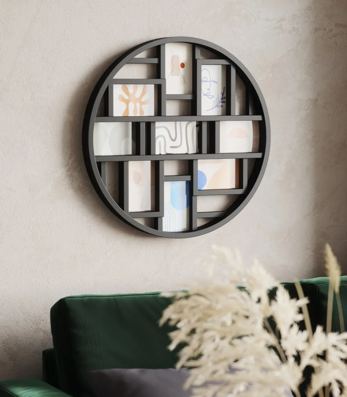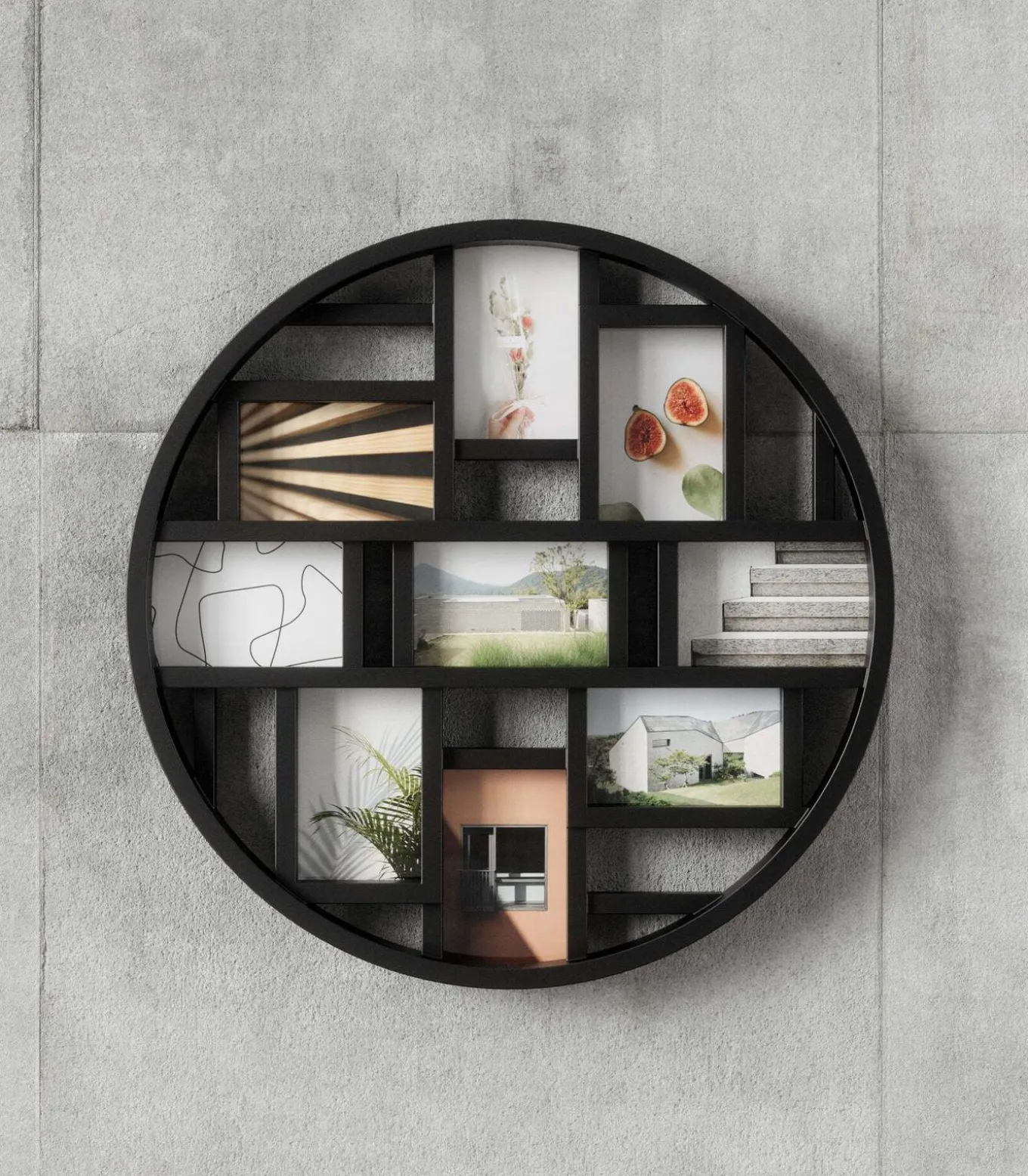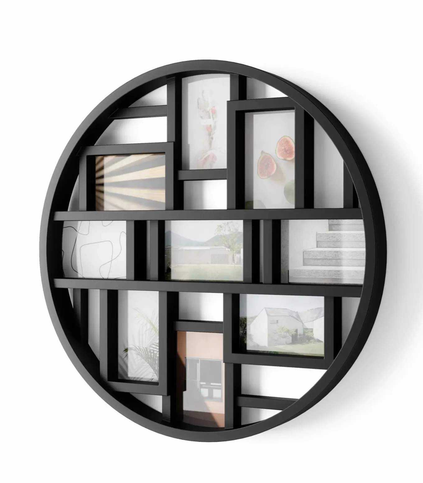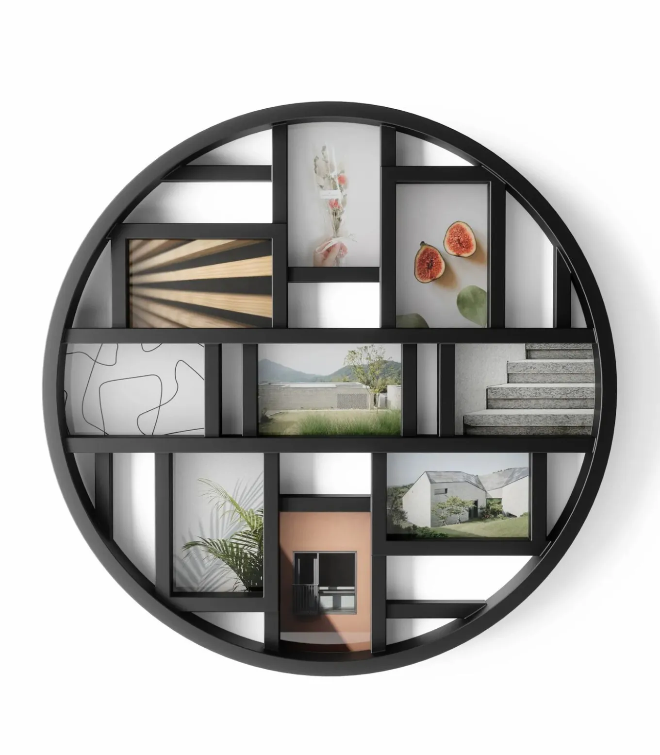 Luna Biedt plaats aan negen van je favoriete 4 x 6 inch foto’s in een moderne, galerijstijl en zal je muur moeiteloos verfraaien. Tegelijkertijd is het praktische ontwerp voorzien van een stevige standaard waarmee je je foto’s gemakkelijk kunt schoonmaken en verwisselen. Luna heeft een diameter van 58,4 cm en wordt geleverd met twee zaagtandhaken die al op het frame zijn voorgemonteerd, waardoor het gemakkelijk op te hangen is.