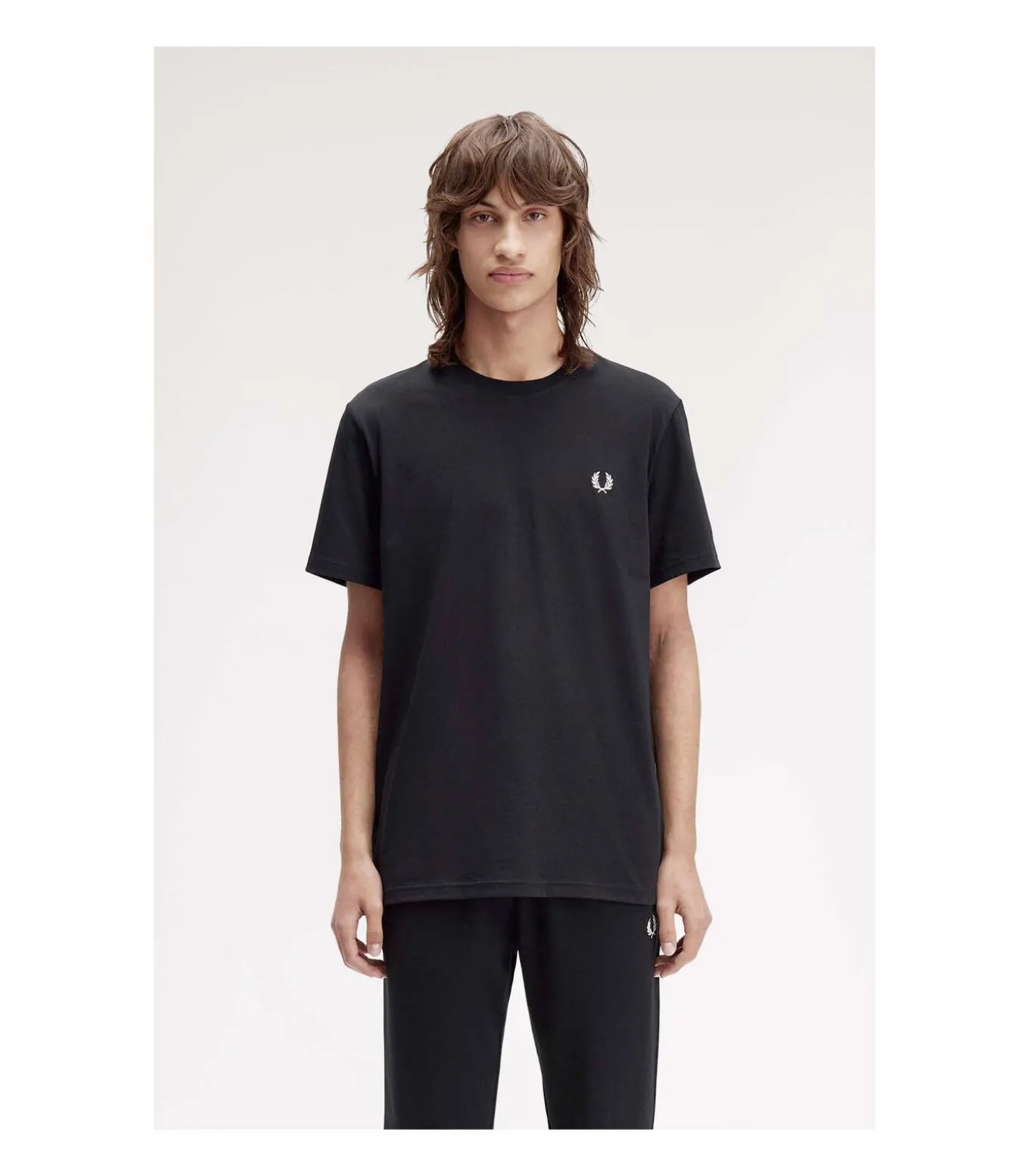 Kleur: zwart. Samenstelling: 100% katoen. Mouwen: kort. Halslijn: ronde hals. Pasvorm: normale pasvorm. Details: katoenen jerseystof, Fred Perry–logo op de rug gedrukt in glanzend plastisol, lauwerkranslogo geborduurd op de borst. Gebruik: ideaal voor een onmisbare urban look met een opvallende grafische touch.