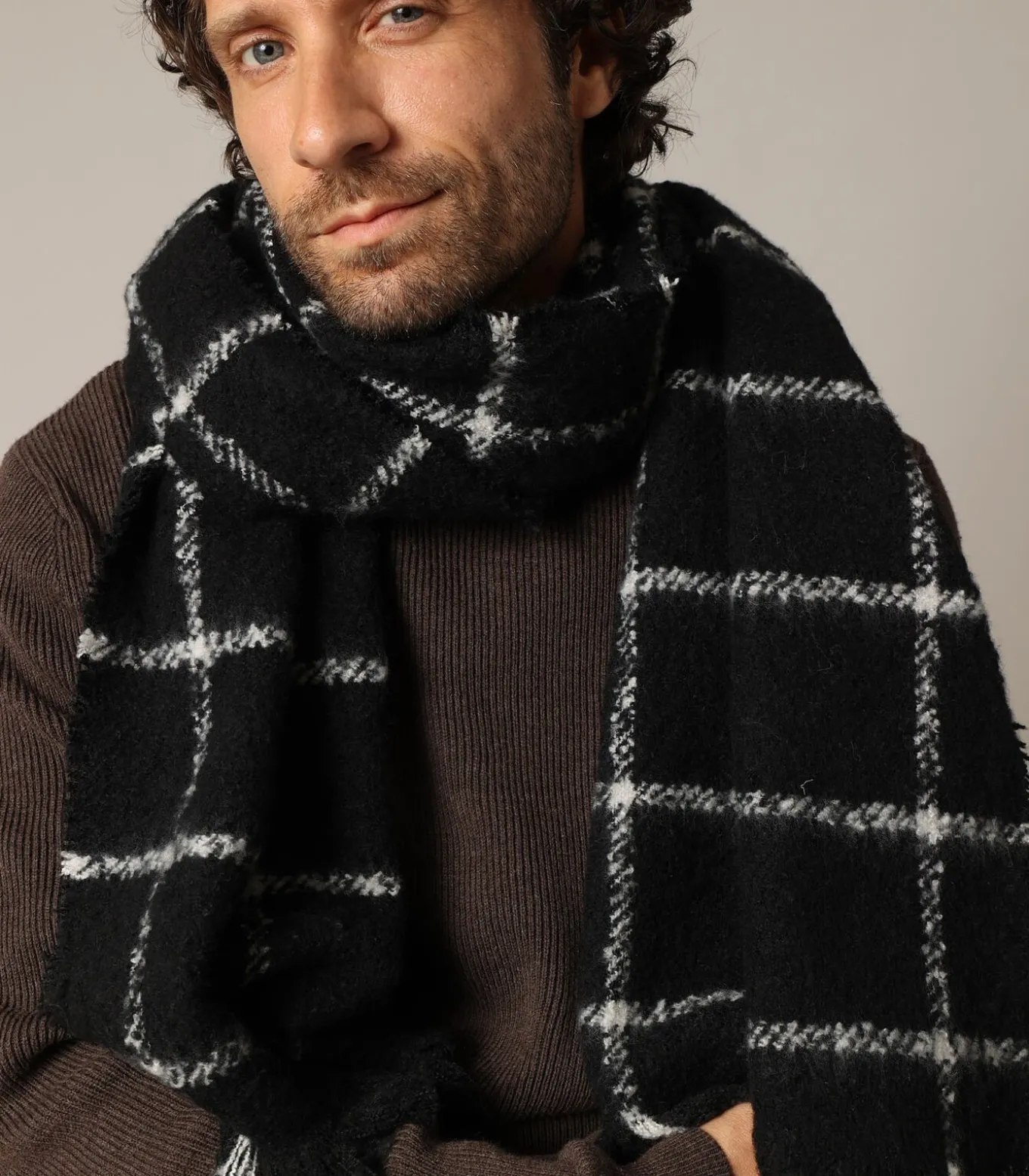 De FREEZE–sjaal, een herenaccessoire, heeft een groot geweven ruitpatroon in een opvallende grafische stijl. De zachte textuur biedt warmte en comfort, ideaal voor koude dagen. De sjaal is versierd met gerafelde franjes aan de uiteinden, wat een casual touch geeft aan dit tijdloze ontwerp. Een makkelijk te combineren winteritem, perfect om een casual of meer formele look te accentueren.