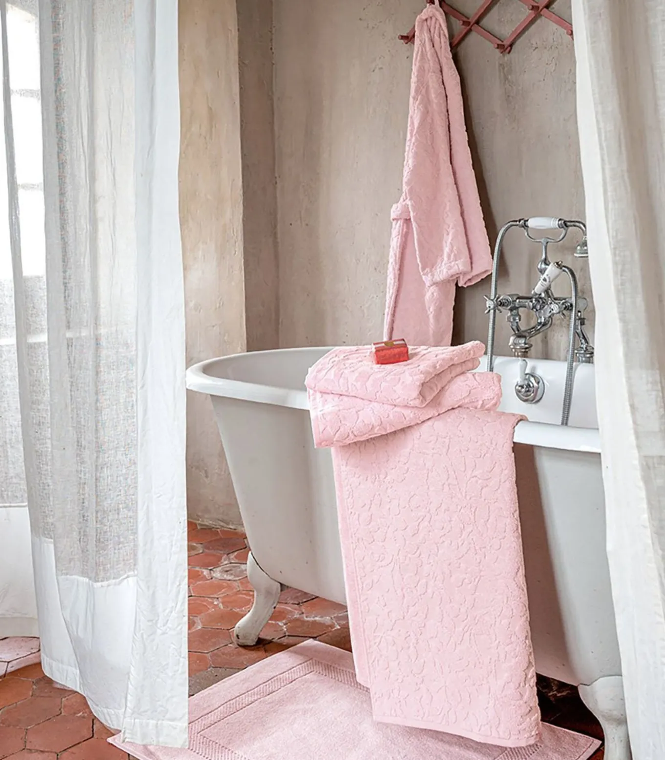Het gewicht van 550 g/m² en de bouclette badstof van 100% gekamde katoen zorgen voor zachtheid en absorberend vermogen.