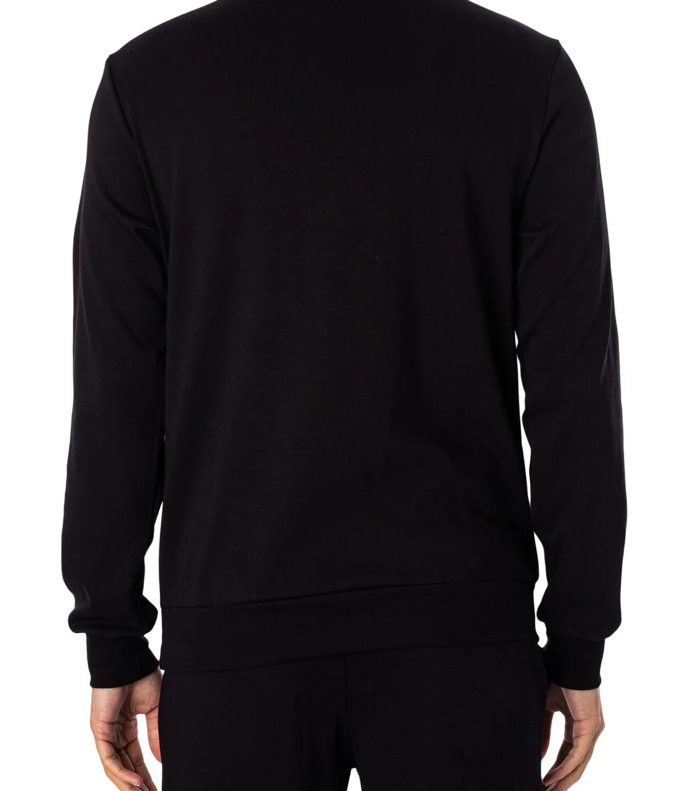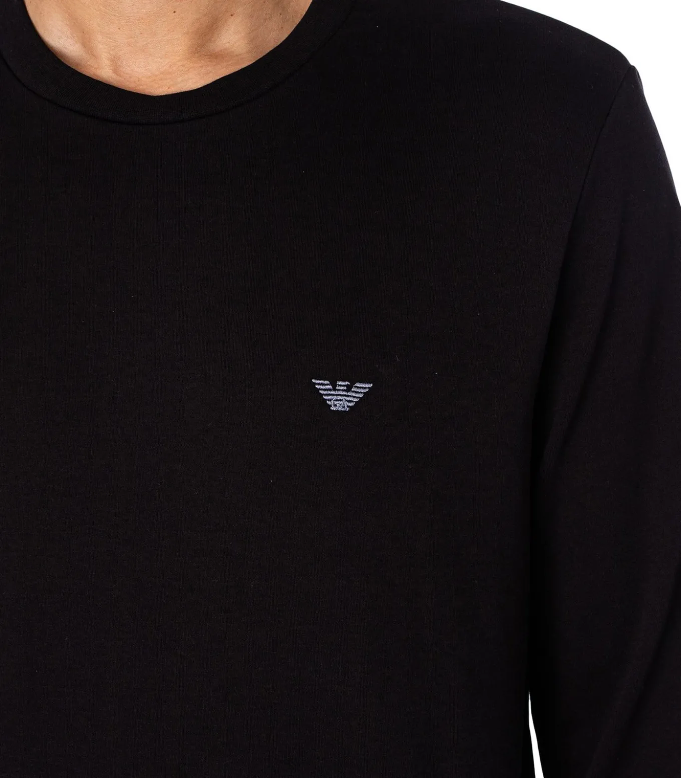 De Emporio Armani gebreide pyjamaset met lange mouwen in zwart combineert luxe met comfort. De top heeft een geborduurd logo op de borst en elastische manchetten en zoom voor een goede pasvorm. De broek heeft open zakken, een elastische taille met trekkoord, elastische enkels en een geborduurd logo, wat zorgt voor functionaliteit en stijl. Deze pyjamaset is gemaakt van hoogwaardige materialen en biedt warmte en comfort, perfect voor een goede nachtrust of loungen thuis.