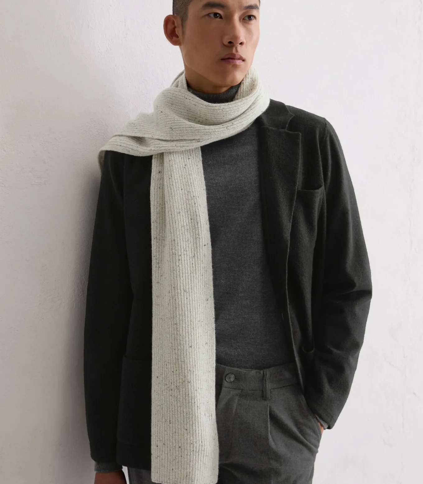 In een royaal formaat: de hoogwaardige gebreide sjaal in tweedlook met kleine kleuraccenten. Gemaakt van een zachte, Italiaanse wolmix met een hoog gehalte gerecyclede wol. De viscose in het garen zorgt voor extra comfort en de polyamide is vormvast. Geribd model met contrasterend logolabel. Stylingtip: draag met de bijpassende muts.