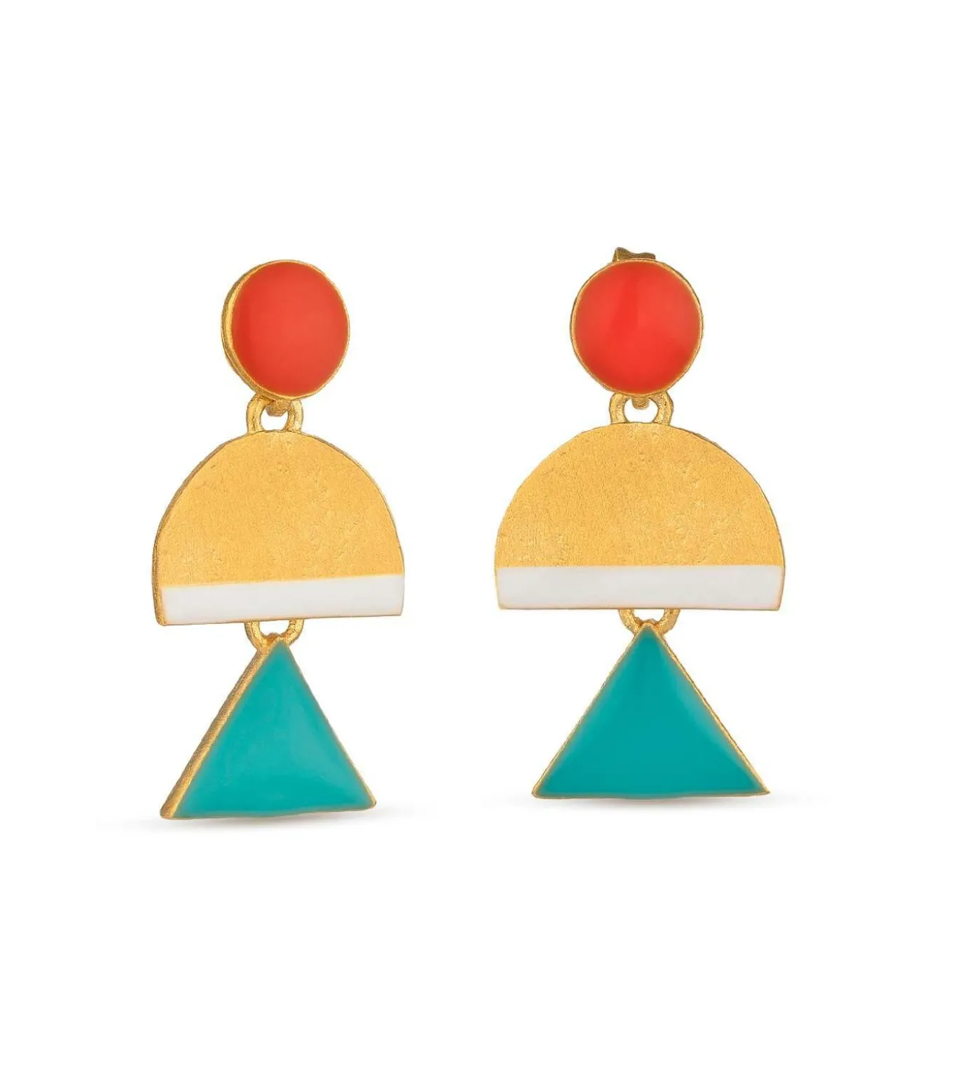 Middelgrote geometrische, vergulde oorbellen die intense kleuren en verschillende vormen combineren en zo zowel dynamiek als sereniteit oproepen. In mat verguld metaal met een 24–karaats gouden laag en koud email. Vlindersluiting.