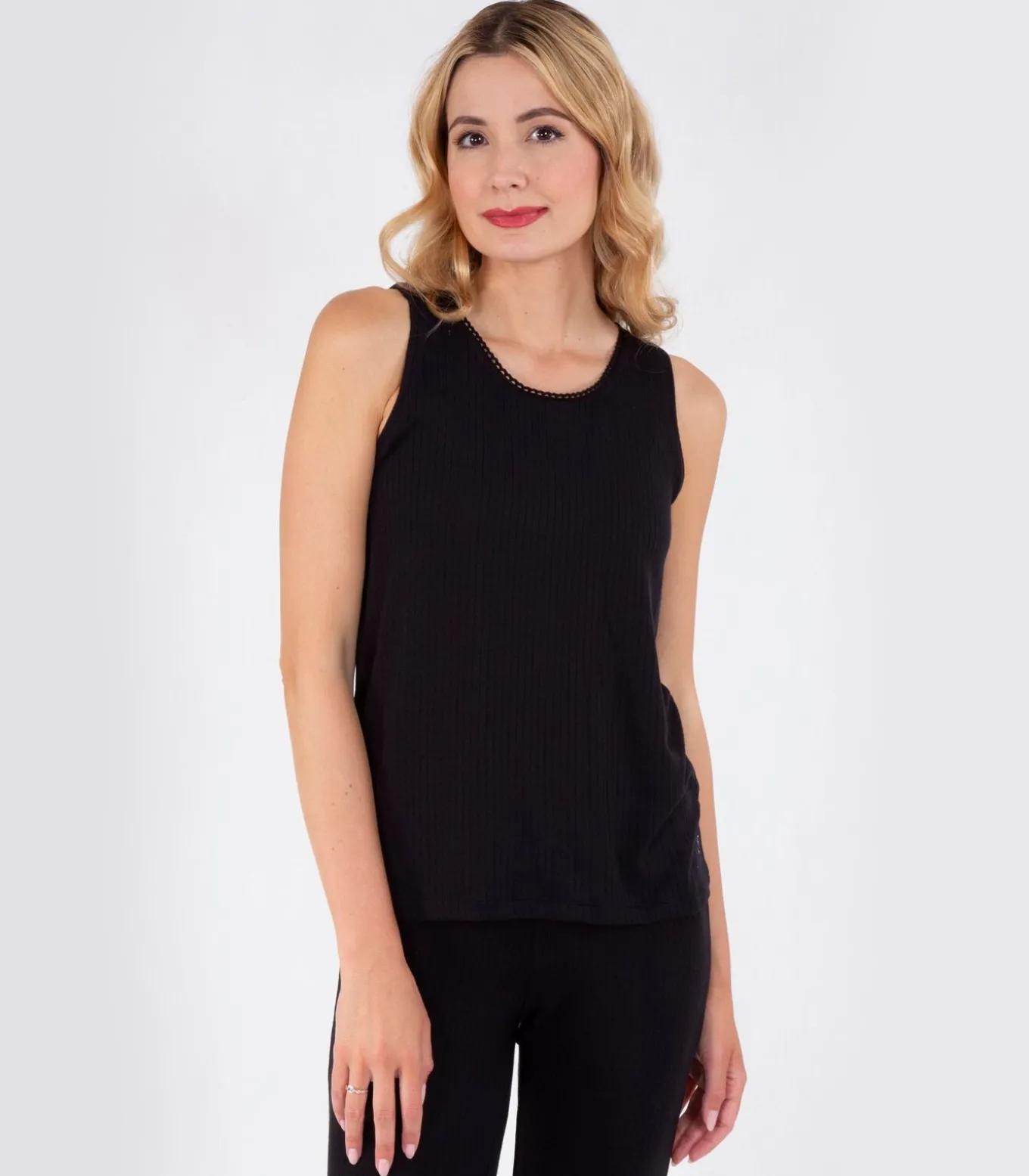 De nieuwe ultrazachte homewear–lijn van Isotoner is grotendeels gemaakt van ECOVERO™ viscose. Deze ribgebreide tanktop in zwart is de perfecte basic. Het combineert veel comfort en elegantie met zijn kanten afwerking. Hij kan worden gedragen in combinatie met de bijpassende broek.