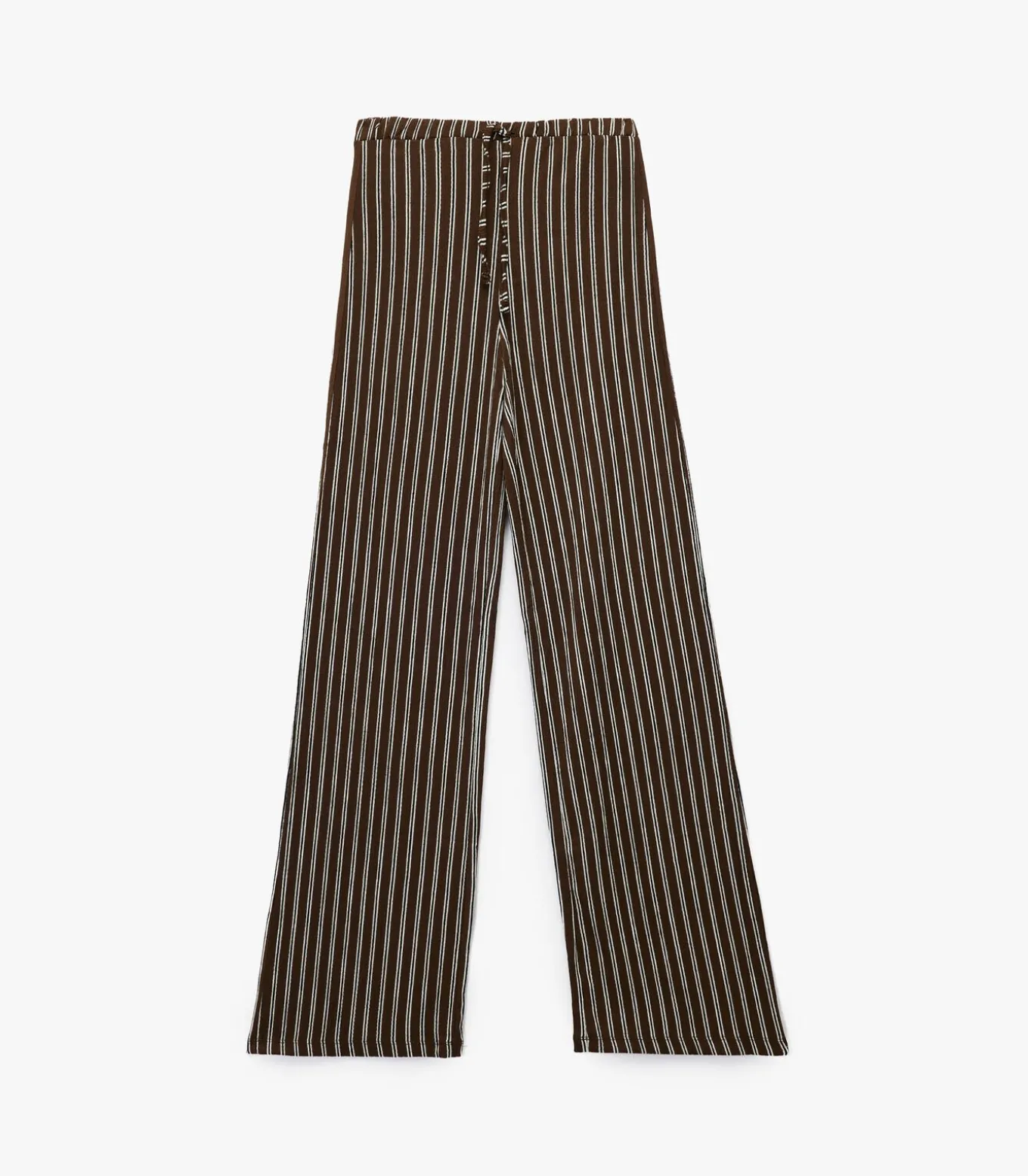 Deze gestreepte broek met hoge taille combineert stijl en comfort. Met een ceintuur in de taille creëert het een elegante look, perfect voor zowel dagelijks gebruik als meer formele gelegenheden. De rechte pijpen en het bürümcük weefsel zorgen voor een moderne uitstraling. Ideaal voor een combinatie met een eenvoudige blouse of blazer voor een professionele uitstraling.