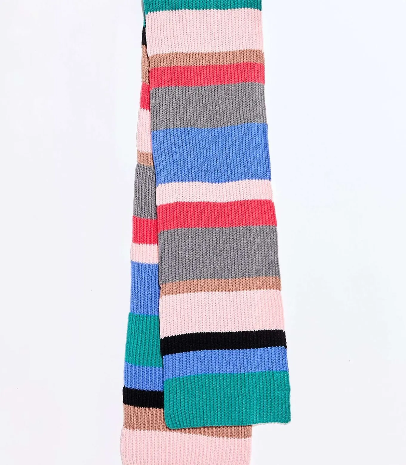 Gestreepte gebreide sjaal, zowel zacht als kleurrijk. Het rechthoekige model en de multicolor strepen geven een speelse en casual touch aan uw winteroutfits. Ideaal om koude dagen op te fleuren. Productdetails: rechthoekige gebreide sjaal met strepen, afmetingen: 175 x 25 cm.
