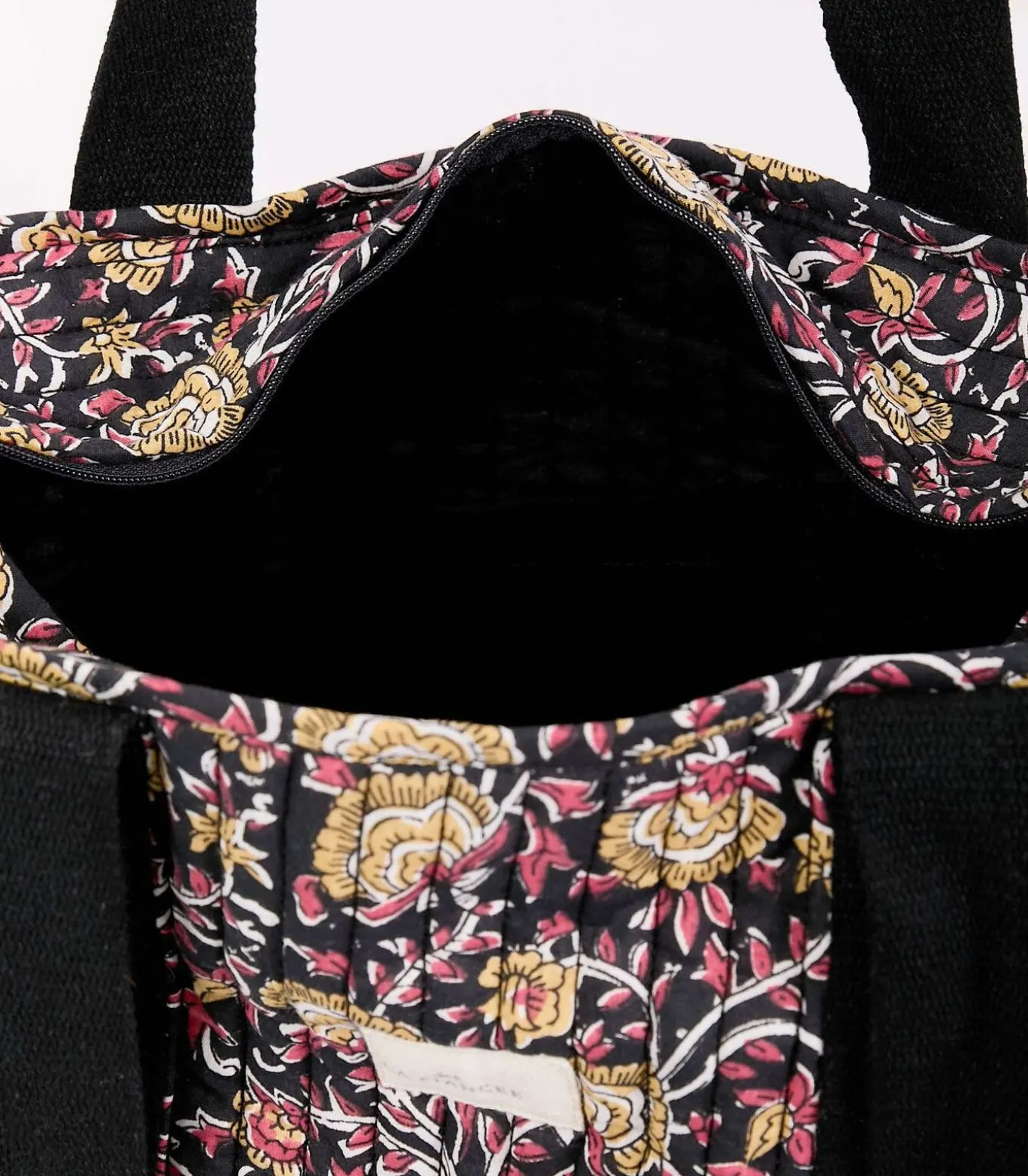 Gewatteerde bedrukte katoenen shopper van biologisch katoen, ideaal voor dagelijks gebruik dankzij het royale formaat en de bedrukte stijl. Praktisch en elegant, gemakkelijk over de schouder te dragen dankzij de lange handgrepen van katoen grosgrain. Het perfecte accessoire om al uw spullen deze zomer mee te nemen. Productdetails: gewatteerde shopper. Bovenkant met ritssluiting. 1 binnenvak. Handgreplengte vanaf de basis: 126 cm. Afmetingen: 35 x 29 x 15 cm.