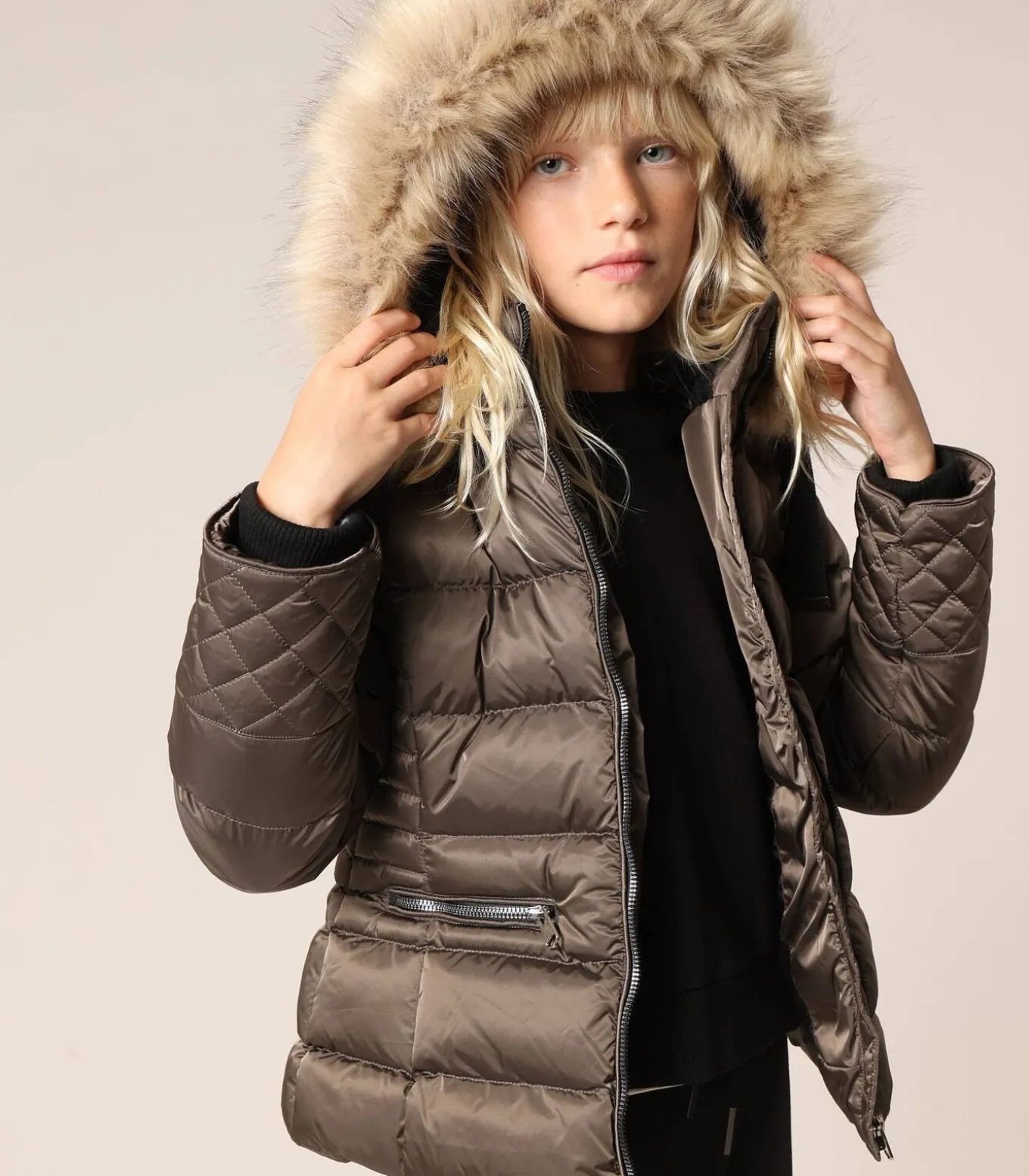 GINNIE meisjes donsjack met een casual, urban stijl. Dit gewatteerde model heeft een comfortabele rechte snit, een rits aan de voorkant en twee praktische ritszakken onderaan. De mouwen zijn afgewerkt met diamantgestikte details voor een elegante touch. De geïntegreerde capuchon is geaccentueerd met een lichte, afneembare rand van imitatiebont voor warmte en stijl. Met een opstaande kraag en brede, platte, decoratieve trekkoorden is dit donsjack ideaal voor koude dagen. Een ronde logopatch is op de linkermouw aangebracht voor een discrete signatuur.