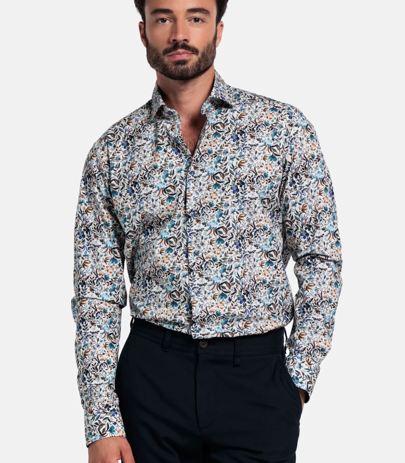 Luxe overhemd van Maggiore, vervaardigd uit 100% hoogwaardig katoen met een verfijnde bloemenprint. De semi cutaway kraag geeft het model een moderne en elegante uitstraling, terwijl de zachte katoenkwaliteit zorgt voor uitstekend draagcomfort. Een stijlvol overhemd dat moeiteloos klasse en persoonlijkheid combineert — ideaal voor zowel zakelijke als casual gelegenheden.