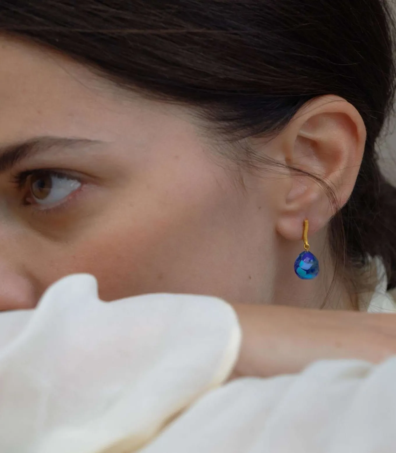 Steekoorbellen van met 24–karaats goud verguld mat metaal met een felblauw bolletje van handgemaakt Murano–glas, met spikkels in andere kleuren. Het ontwerp is geïnspireerd op de mozaïeken van de binnenplaats van Casa Batlló, ontworpen door architect Antoni Gaudí in 1904 – 1906. Vlindersluiting.