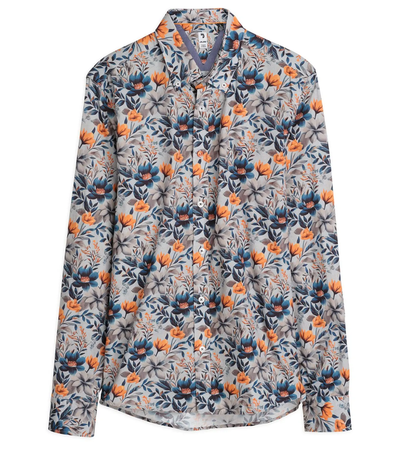 Ga voor een stijlvolle en trendy look met dit grijze herenoverhemd met bloemenmotief, geïnspireerd op de betoverende sfeer van Santiago. Gemaakt van 100% katoen, biedt dit overhemd optimaal comfort dankzij de rechte snit en zorgvuldige details. Het plantenprintpatroon zorgt voor een frisse en moderne touch, terwijl de klassieke kraag en knoopsluitingen een vleugje verfijning toevoegen. De lange mouwen en afgeronde manchetten zorgen voor een klassieke en veelzijdige stijl. Het geborduurde J&JOY–logo op de borst en het koord geven dit must–have item een vleugje authenticiteit. Bestel nu en voeg een vleugje charme toe aan je garderobe.