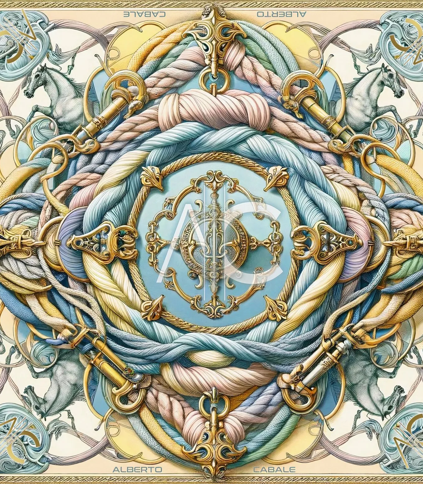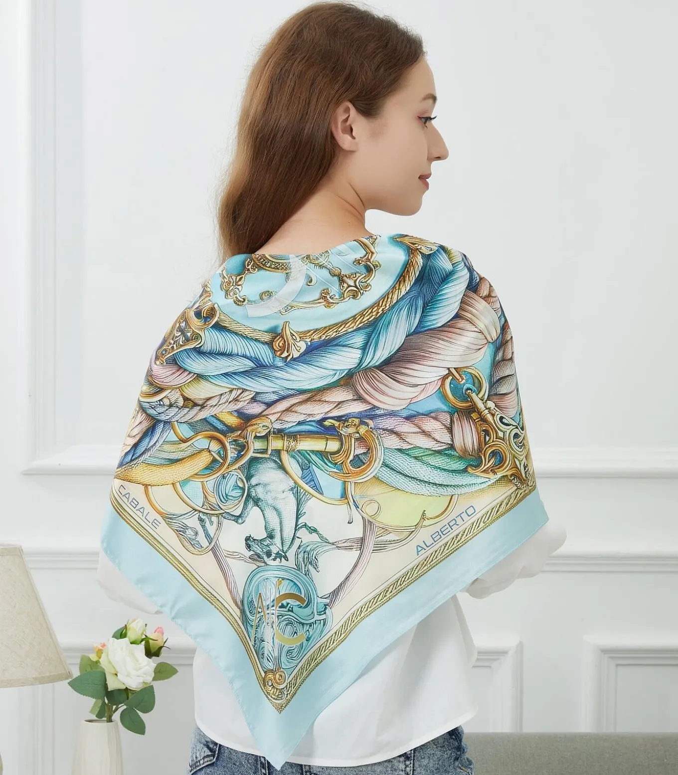 Beschrijving: De sjaal “Spring Rope” uit de Zoé collectie van Alberto Cabale belichaamt een voortreffelijke fusie van barokstijl en lentemotieven. Gemaakt van 100% zijde, toont deze grote vierkante sjaal van 90×90 cm een rijke compositie van sierlijke details verweven met bloem– en maritieme elementen in zachte pasteltinten. De gouden koordmotieven en delicate bloemen creëren een betoverend en elegant visueel effect, waardoor deze sjaal een must–have is om een outfit met verfijning te verfraaien.Samenvatting:Grootte: 90×90 cmMateriaal: 100% zijdeMotief: Siermotieven, koorden, en maritieme elementen verweven met bloemenOverheersende kleur: Pastelblauw, goud, en vleugjes rozeCadeaudoos: Geleverd in onze luxe cadeaudoos, is de “Spring Rope” sjaal klaar om cadeau te geven, perfect voor degenen die waarde hechten aan verfijnde accessoires en zorgvuldig uitgewerkte artistieke ontwerpen.Grootte van de fashion vierkante sjaal.