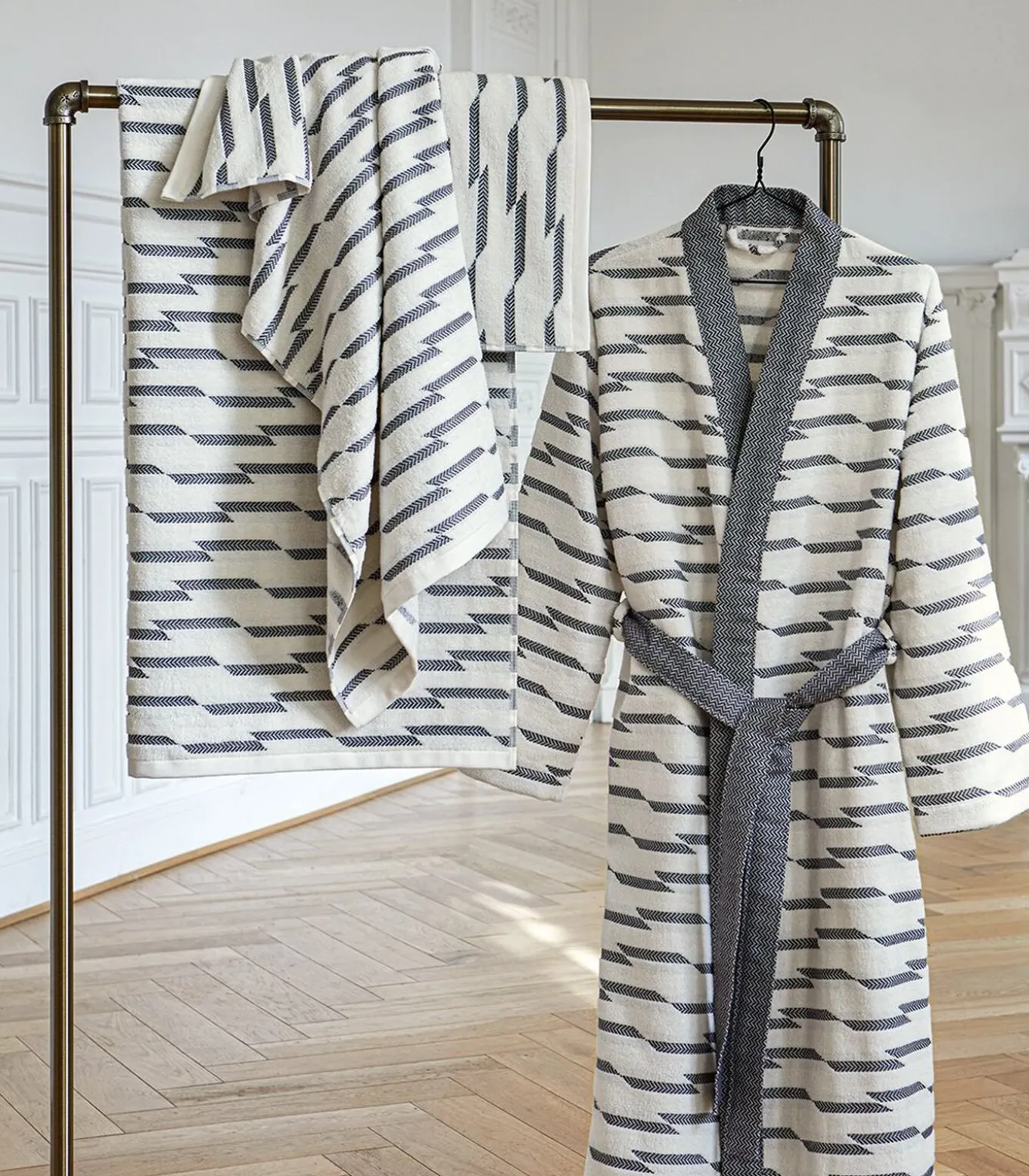 Het gewicht van 550 g/m² en de bouclette badstof van 100% gekamde katoen zorgen voor zachtheid en absorberend vermogen.