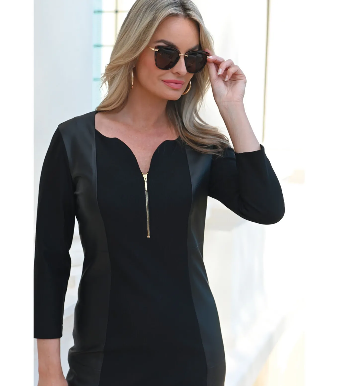 Jurk met 3/4 mouwen van twee materialen: zwart kunstleer en zwart milano – Nauwsluitende pasvorm – Hartvormige halslijn met gouden metalen ritssluiting – Horizontale uitsnijdingen aan de zijkanten op de kunstleren delen. Onzichtbare ritssluiting middenachter – LENGTE maat 36 tot 50 (van schouder tot zoom): 93 tot 100 cm – Het model draagt maat 38.