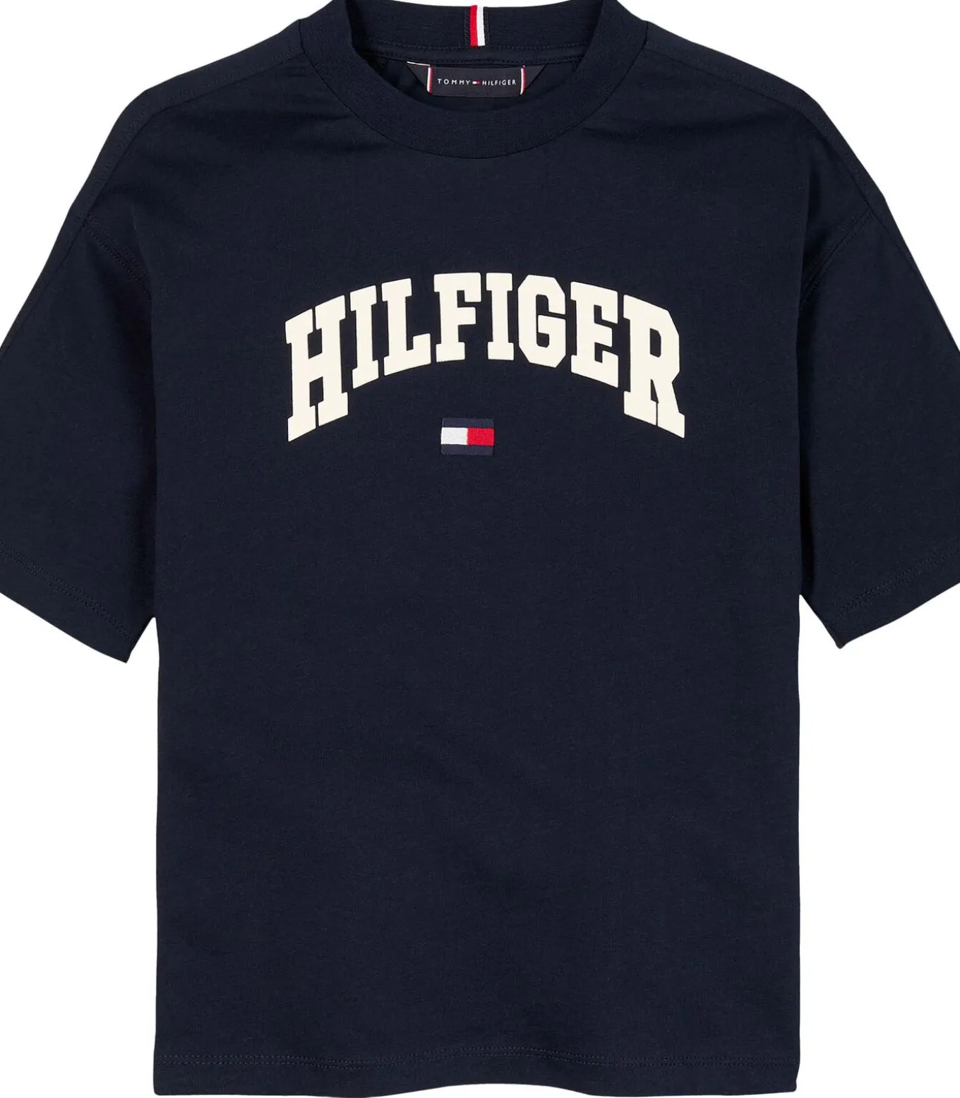 Kleur: Donkerblauw Samenstelling: 100% katoen Mouwen: Raglan Halslijn: Ronde hals Pasvorm: Normaal Details: Puur katoenen T–shirt met college–stijl Tommy Hilfiger–logo op de borst, geborduurde vlag op de mouw en iconische tape in de nek. Een perfecte mix van retrostijl en sportieve spirit. Gebruik: Perfect voor vrije tijd, school of om sportieve en casual outfits compleet te maken