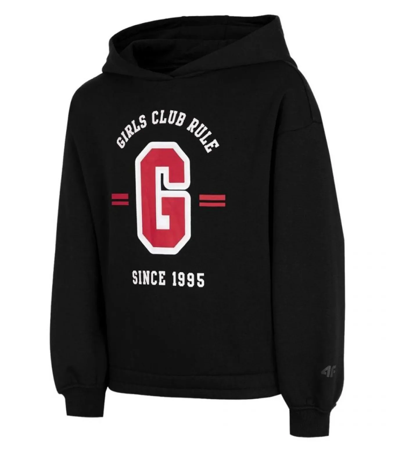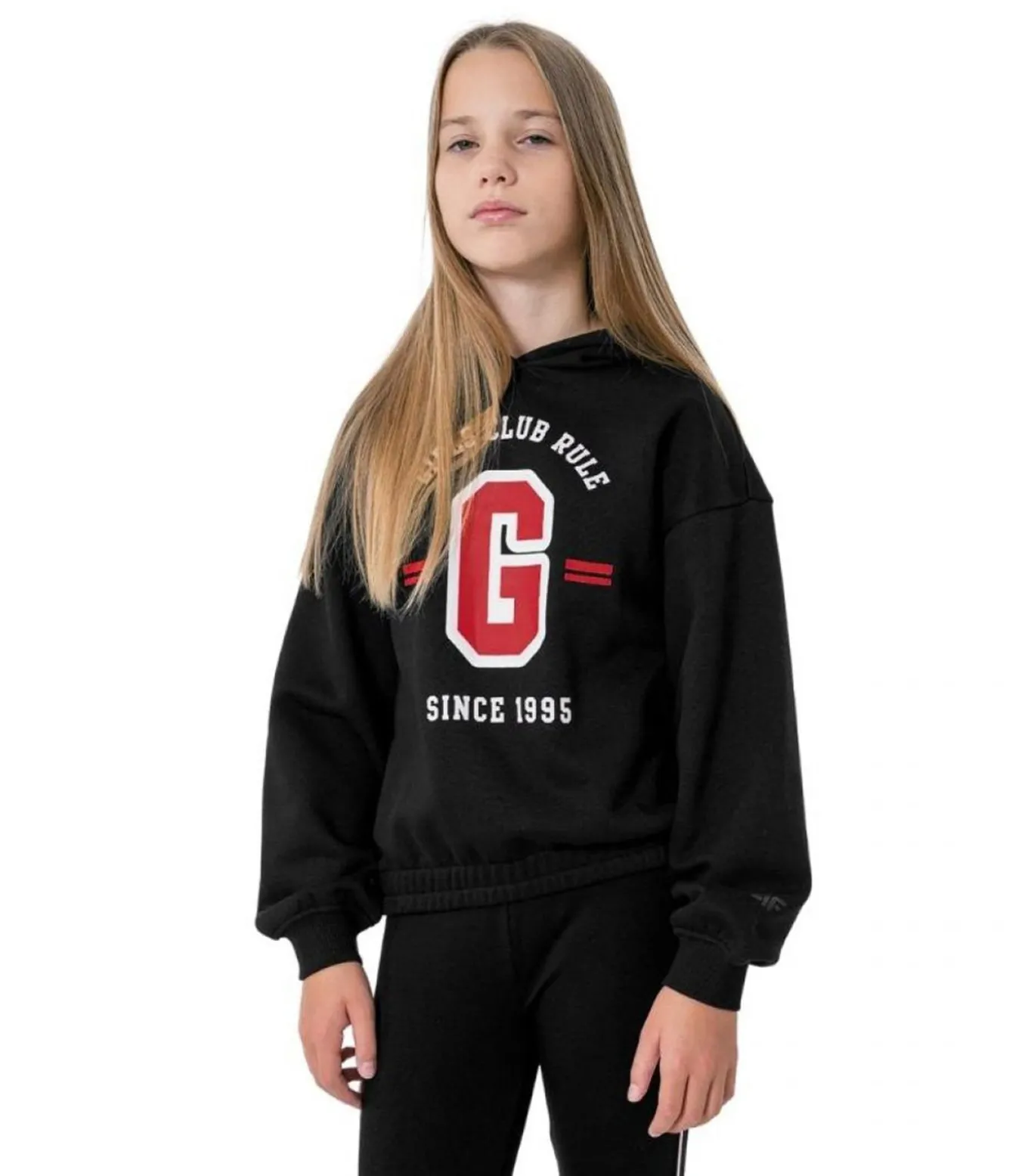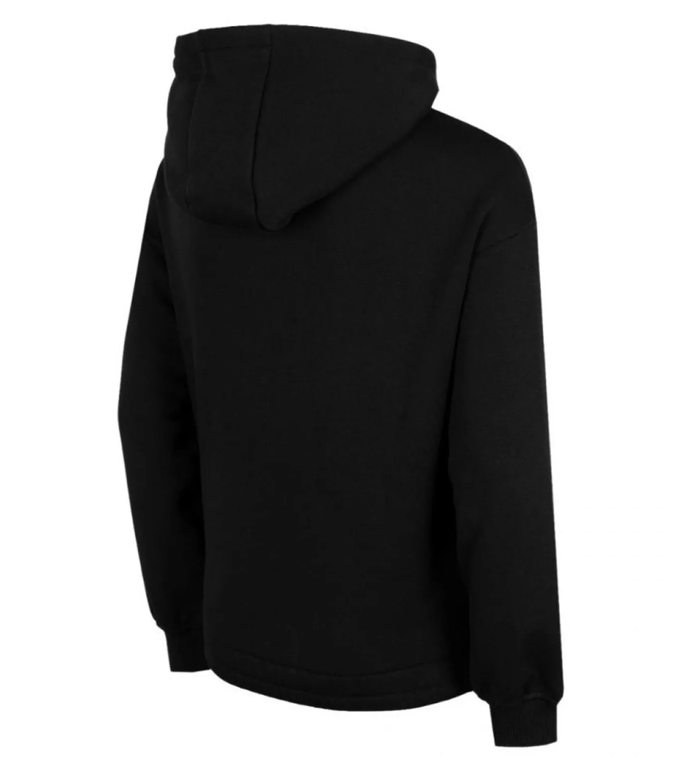 Trui met kap model 4F, HJZ22 JBLD004 – Zwart is een trui die geproduceerd werd door merk JBL. Deze trui is gemaakt van katoen en polyester en heeft een geborsteld oppervlak. Het ontwerp van deze trui omvat gedrukte logo’s, teksten en druktekeningen. De trui bezit elastische zoom en kan taps toegeklapt worden. De kap van de trui is aan te trekken en heeft verlaagde rugschoudernaden. De halslijn is een kapitein en de mouwen zijn lang. De manchetten hebben ribbelpatroon. De trui wordt vastgehouden door een trekband aan de achterkant. De trui heeft twee grootten: 8 jaar met een schoudervleugel van 26 inch en 10 jaar met een schoudervleugel van 28 inch.