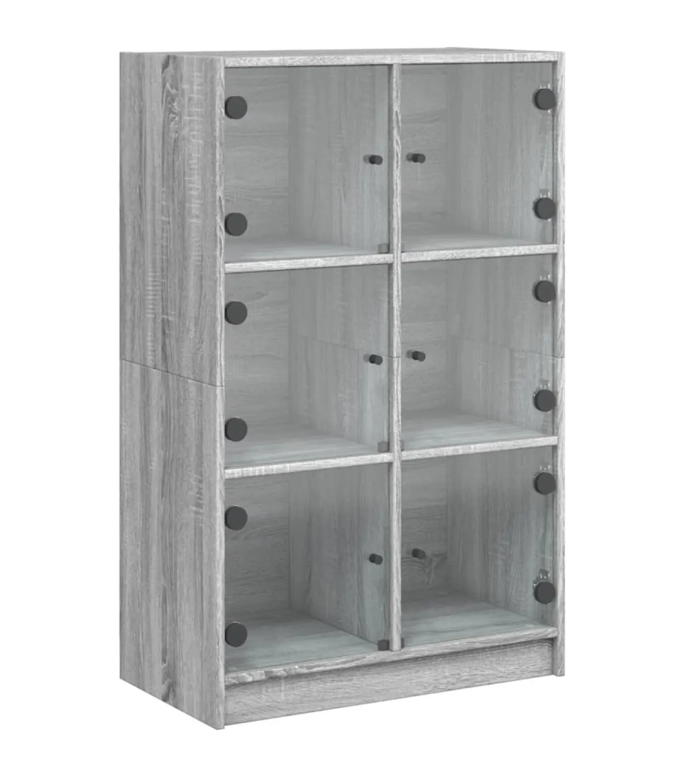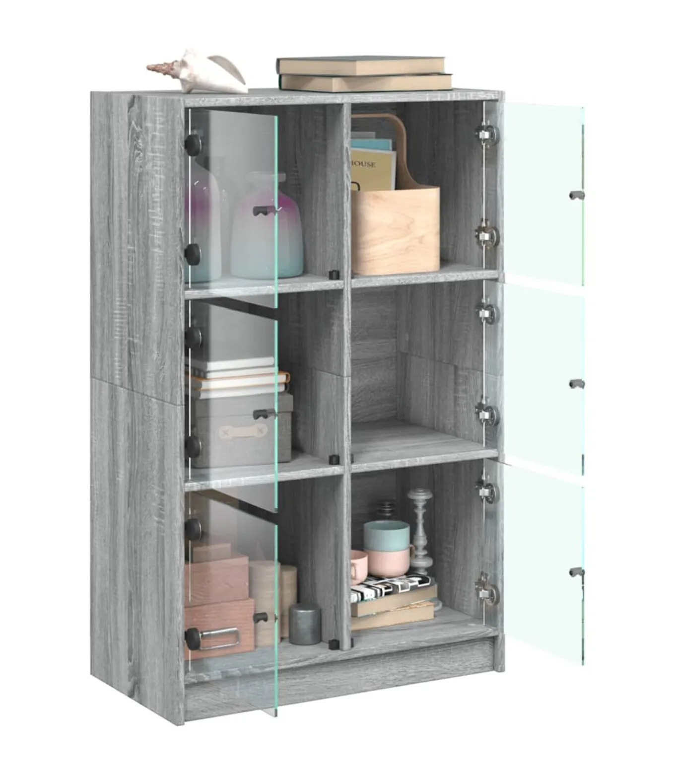 Praktisch ontwerp: hou je spullen stofvrij door ze achter de deuren op te bergen. De zwarte handgrepen zorgen ervoor dat de hoge kast eenvoudig te openen is.