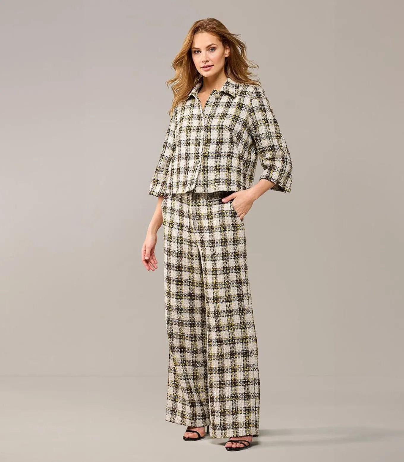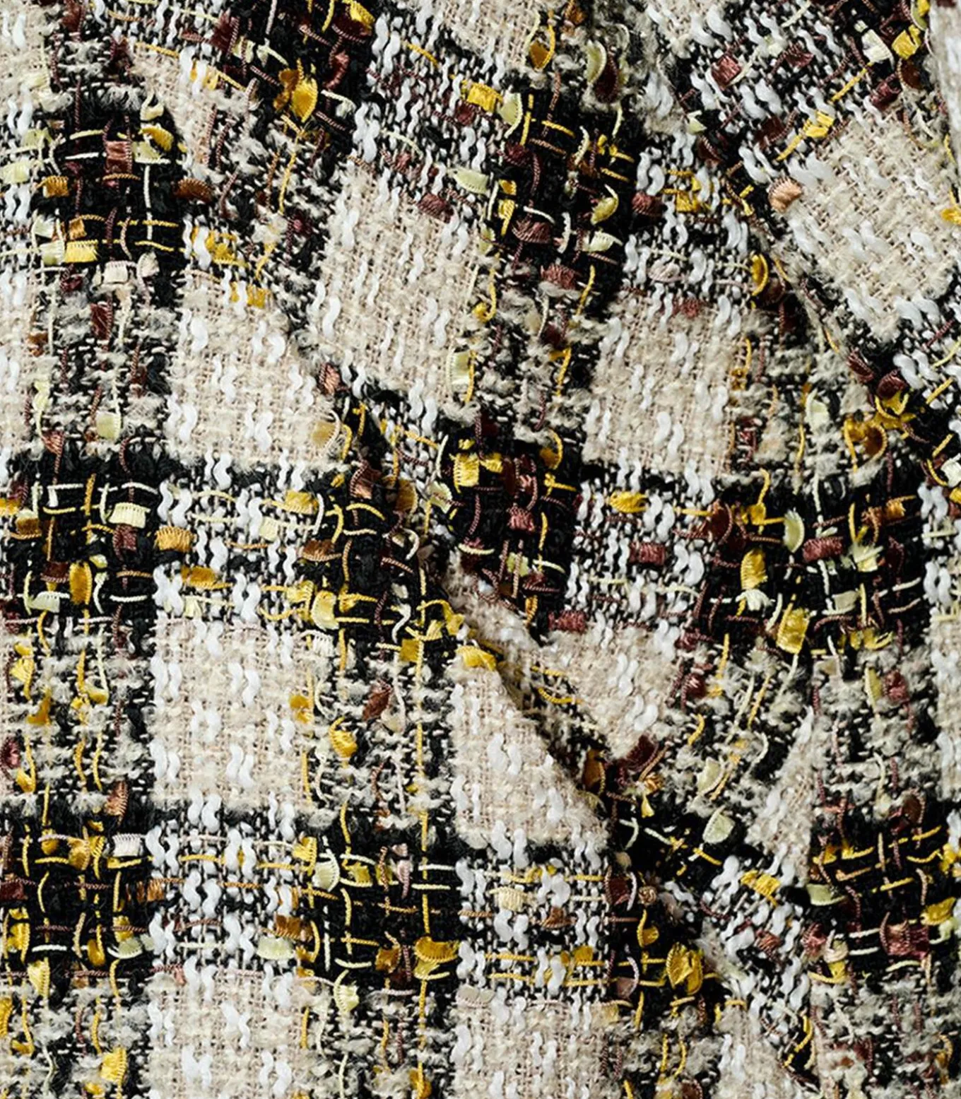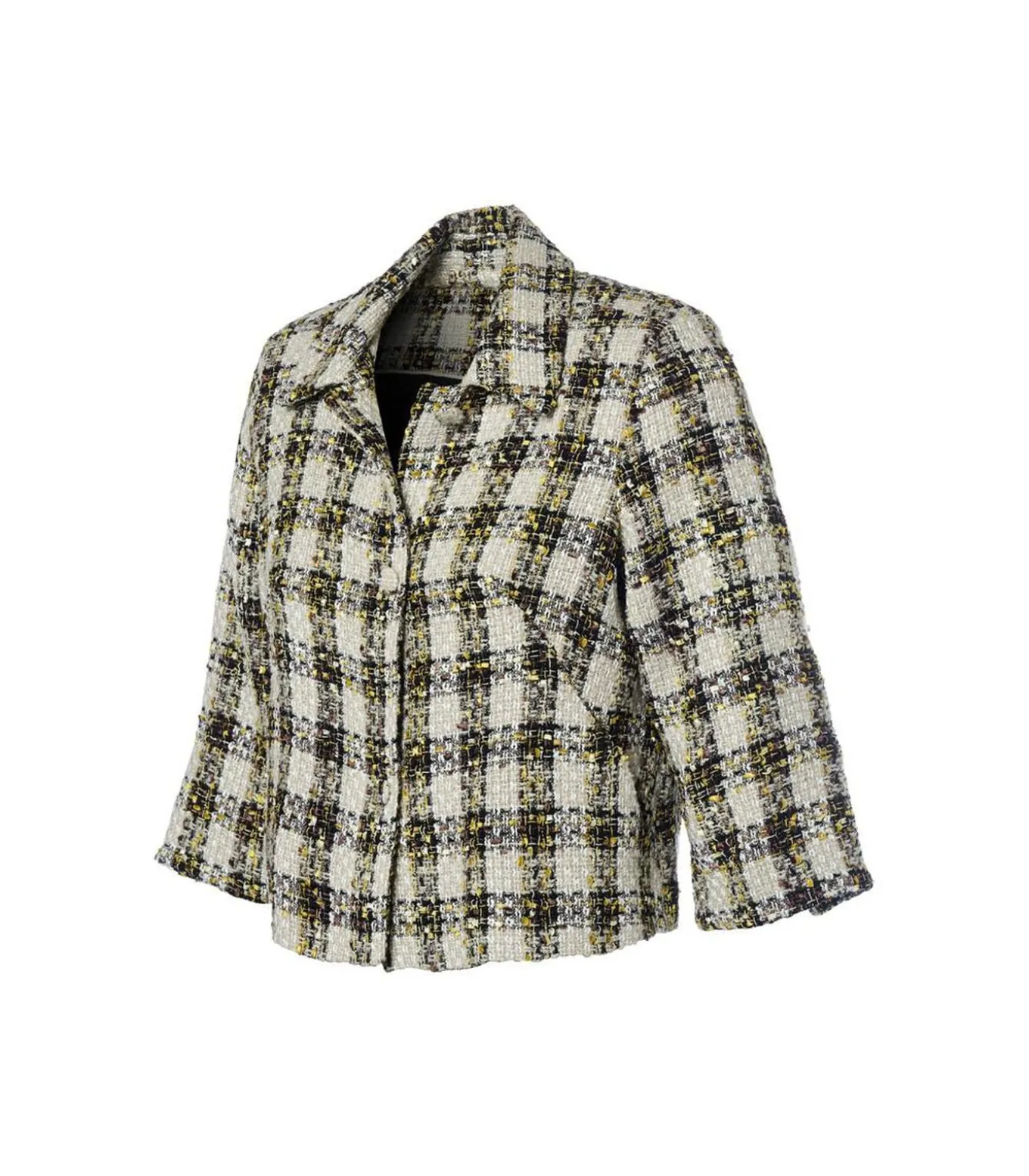 Dit seizoen is er één jasje dat je niet wilt missen: het modieuze bouclé jasje dat in elke garderobe een statement maakt. Het jasje heeft een korte, rechte pasvorm en driekwart mouwen voor een moderne uitstraling. De combinatie van beige, bruin, zwart en geel in een gestructureerde boucléstof geeft het jasje een stijlvolle en elegante uitstraling. De doorknoopsluiting is bedekt met dezelfde bouclé stof, terwijl de blazer is afgewerkt met een klassieke kraag en schuine steekzakken. De achterzijde van de mouwen heeft kleine splitjes, wat het design extra verfijnd maakt. De voering in klassiek zwart polyester maakt de blazer compleet. Fashiontip: Ontdek ook de Jacky blazer in groen/roze.