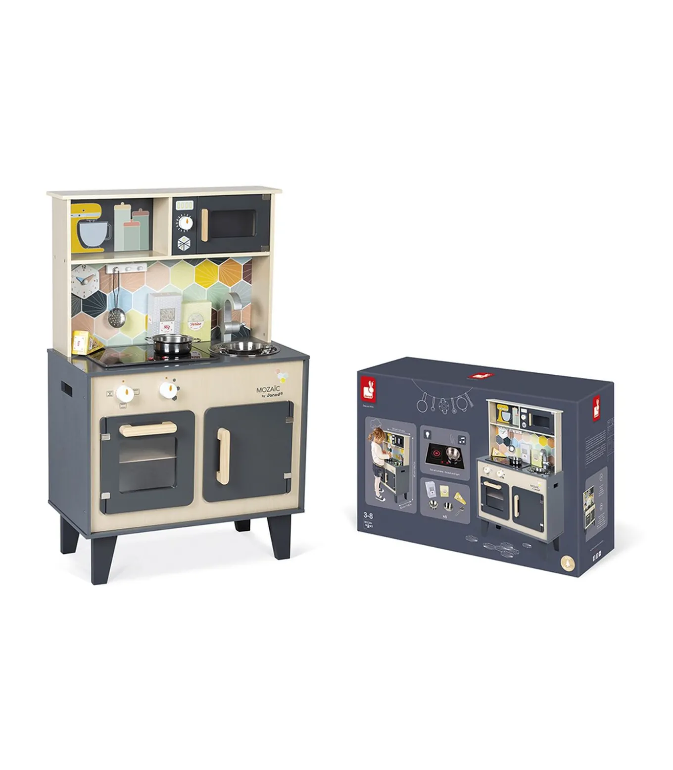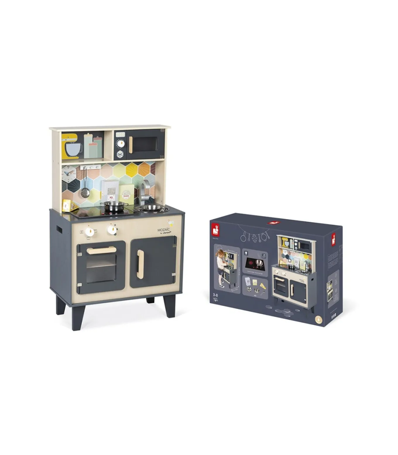 Janod Keuken MozaicDe Janod Keuken Mozaic is een prachtige speelkeuken voor kinderen die dol zijn op koken en bakken. Deze keuken is gemaakt van hoogwaardig hout en heeft een stijlvol design met vrolijke kleuren. Met de verschillende accessoires kunnen kinderen hun eigen culinaire avonturen beleven.De keuken is voorzien van een oven, een kookplaat, een gootsteen en een kraan. Daarnaast heeft het ook een krijtbord waar kinderen hun menu’s op kunnen schrijven. De keuken is uitgerust met draaiknoppen en een oven die echt open kan. Hierdoor kunnen kinderen hun fantasie de vrije loop laten en hun eigen gerechten bereiden.De Janod Keuken Mozaic is niet alleen leuk om mee te spelen, maar ook educatief. Het stimuleert de creativiteit, de fijne motoriek en de sociale vaardigheden van kinderen. Een geweldig cadeau voor kleine chef–koks in spe!Geschikt voor kinderenMet mozaïekpatroonInclusief keukenaccessoiresStimuleert de creativiteit