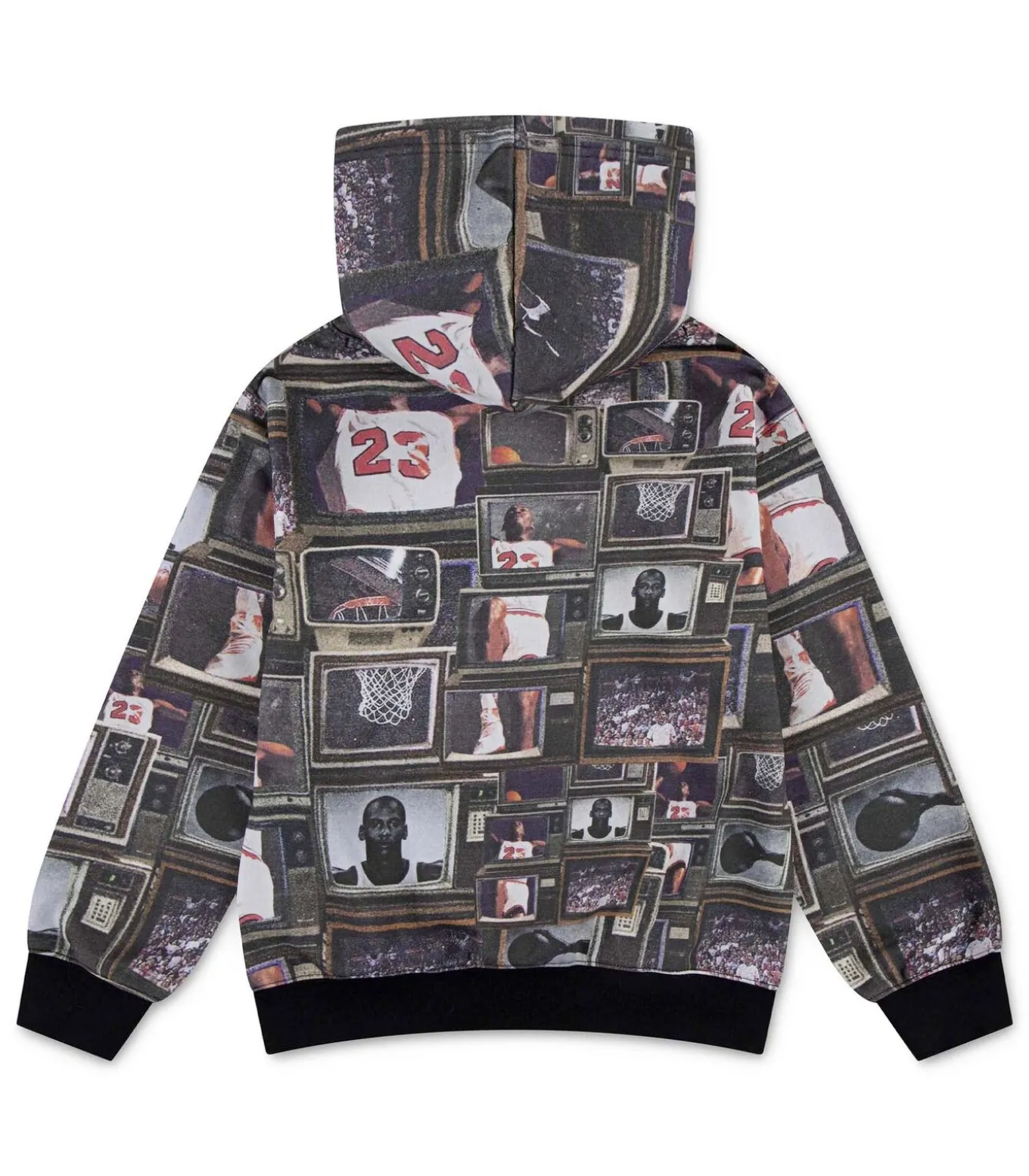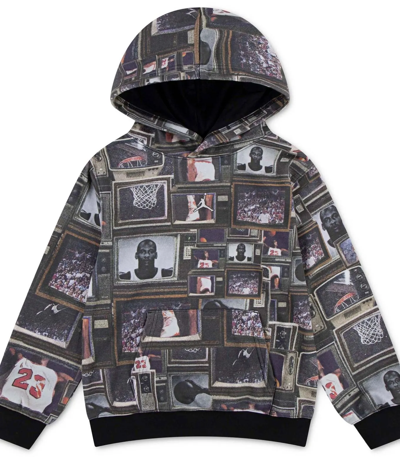 Kleur: Zwart Samenstelling: 80% Katoen, 20% Polyester Mouwen: Lang Pasvorm: Regular Fit Details: Vaste capuchon, kangoeroezak, geribbelde manchetten en zoom, all–over print geïnspireerd op Michael Jordan Gebruik: Ideaal voor jonge basketbalfans, perfect voor school, training en vrijetijdsmomenten met een sportieve stijl