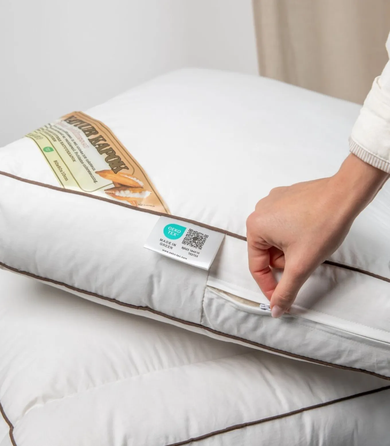 Kapok Hoofdkussens zijn verzegeld door een hygiëne–verzegeling, zo bent u ALTIJD gerustgesteld van een nieuw, ongebruikt en onbeslapen hygiënisch product.