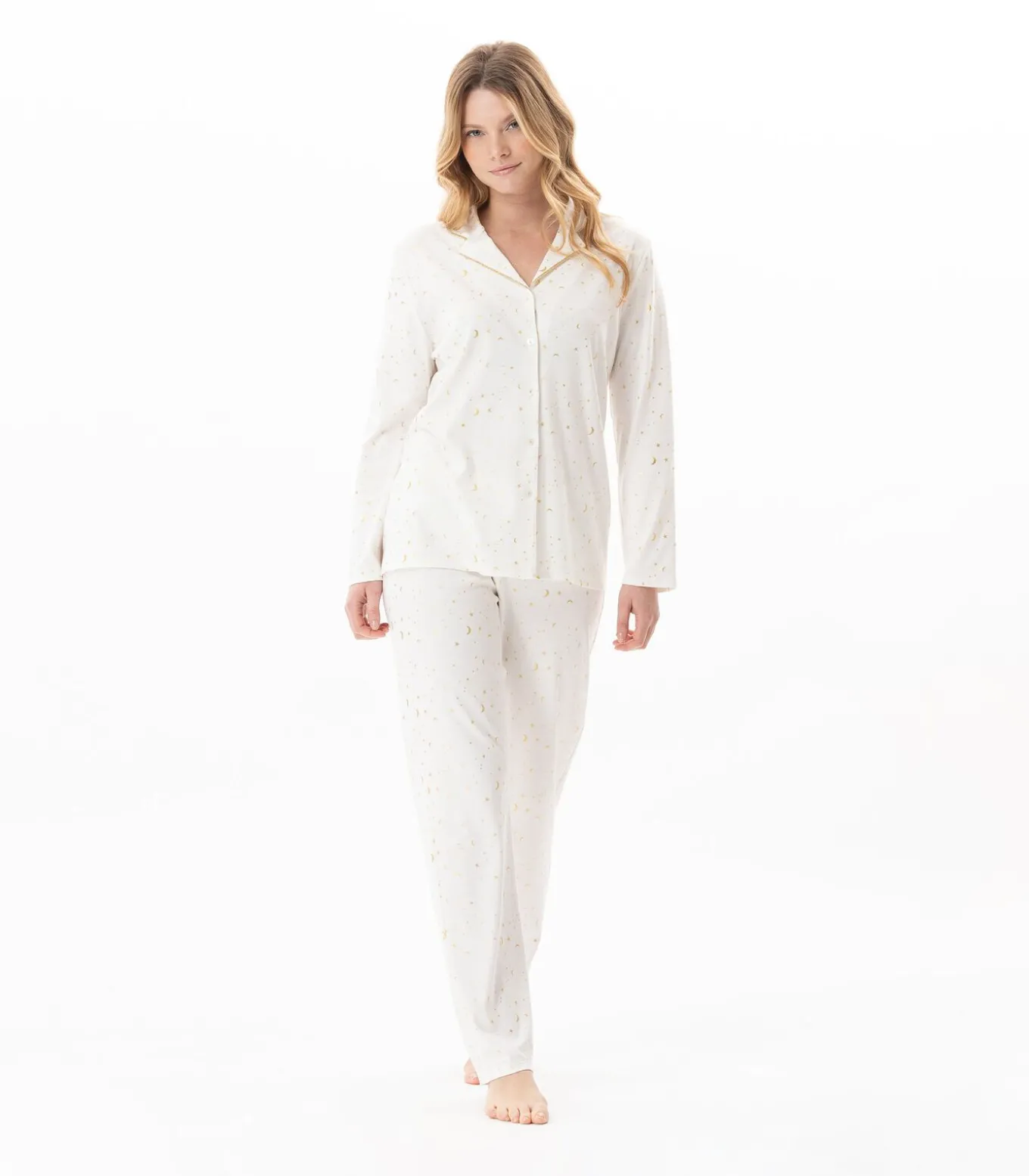 De Luna pyjama met knopen heeft een gemakkelijke opening die vooral handig is bij het geven van borstvoeding, ziekenhuisopnames of gewoon om je moeiteloos aan te kleden. Dit model valt ook op door de zorgvuldige afwerking en de sterrenbeeldprint van de Grote Beer, die een dromerige touch toevoegt aan rustige nachten. De Luna pyjama met knopen is verkrijgbaar in twee uitvoeringen: een gouden print op een ecru achtergrond of donkergrijs op gemêleerd grijs. Maak je nachtkleding compleet met een kamerjas, badjas of een onmisbaar jasje om je warm te houden als je uit bed stapt.