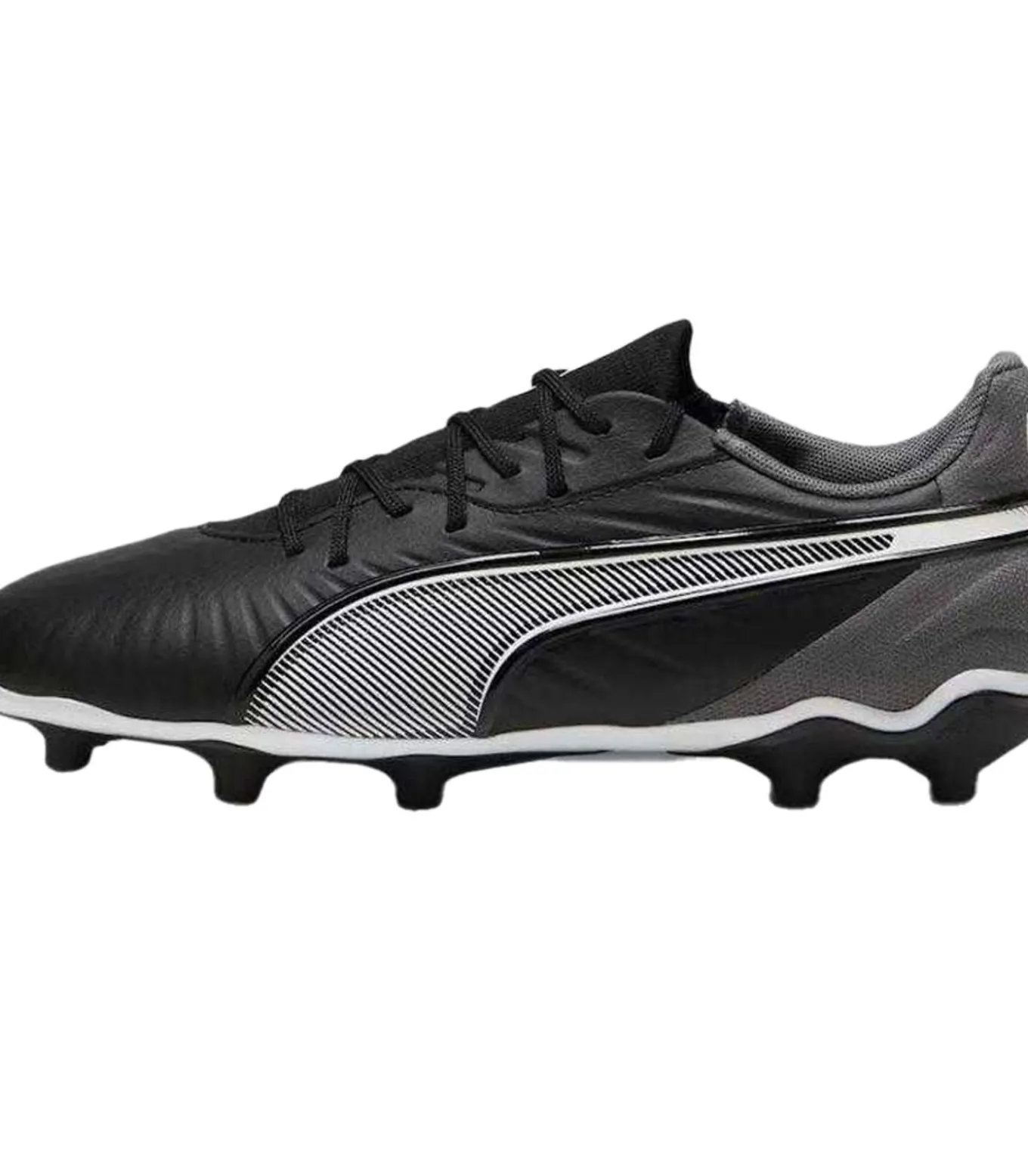 Puma King Match zwarte microvezel synthetische voetbalstoets met lichte gewicht buitenzool en tractie grip, samengesteld uit 8 oogjes met gewatteerde kraag en vlakke, laag gesneden ontwerp in ronde stijl. Deze stoets is geschikt voor kunstmatige en vast ondergronden en is gemaakt van hergebruikbare materiaal. Het binnen– en tussenzool bestaat eveneens uit synthetisch materiaal, terwijl de buitenzool een lichtgewicht TPU laag met tractie grip bevat. Deze King Match voetbalstoets is gemaakt voor regelmatig gebruik.
