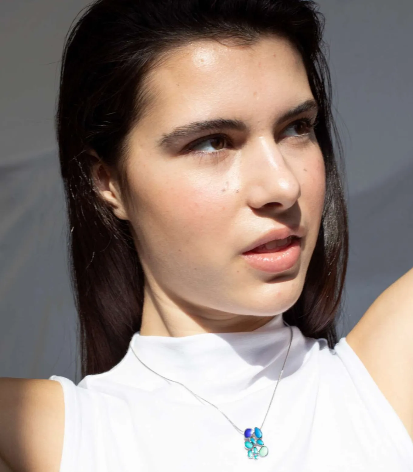 Ketting van glanzend 925 zilver met een klein hangertje in ovale vormen van vlamemail in blauw en turkoois. Stuk geinspireerd door de decoratieve elementen van de Casa Batllo, het werk van architect Antoni Gaudí, 1904–1906. Ketting met musketonsluiting en een verlengstuk.