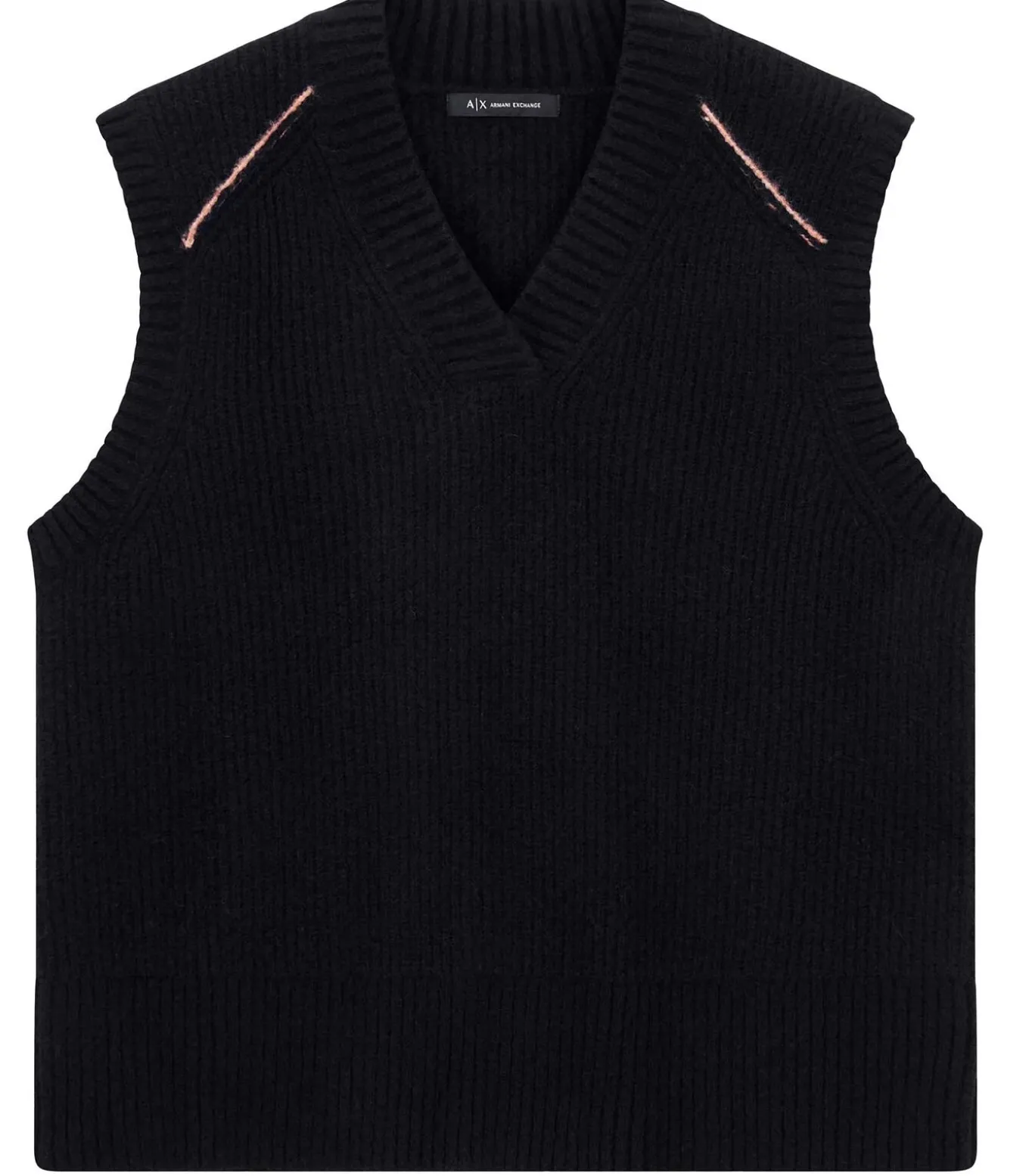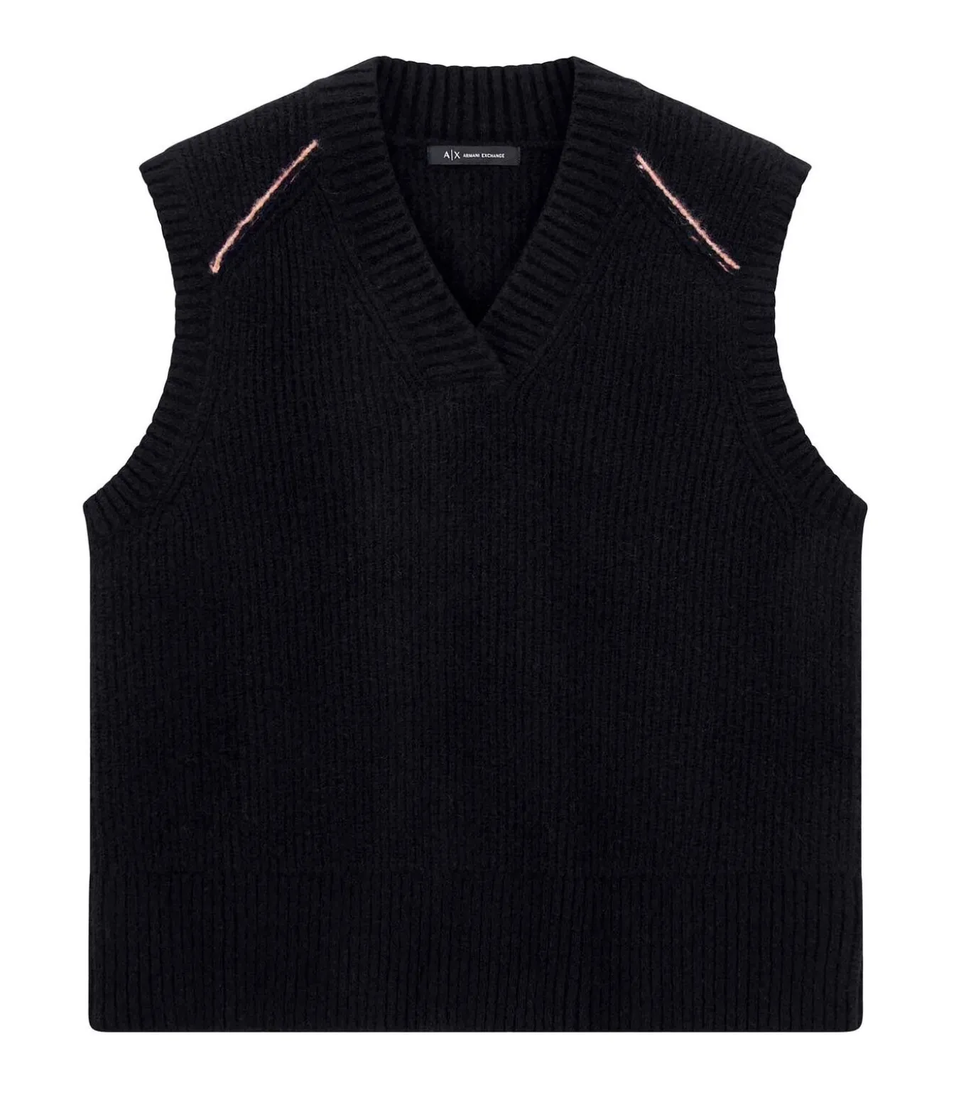 Kleur: zwart. Samenstelling: 38% acryl, 38% polyamide, 10% wol, 7% alpacawol, 7% elastaan. Mouwen: mouwloos. Halslijn: V–hals. Details: geribbeld, contrasterende stiksels op de schouders. Gebruik: gebreide damestop met een verfijnd en eigentijds design, perfect voor elegante laagjeslooks of casual–chique outfits.
