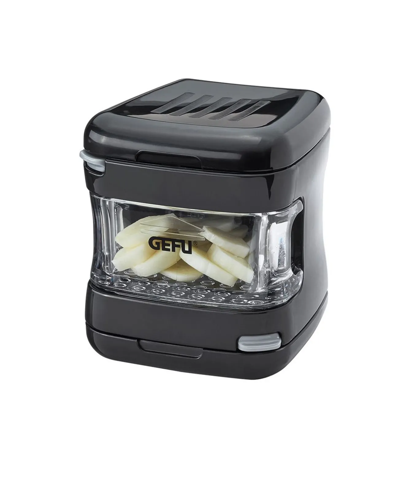Een kubus die veel kan! Pennetjes of plakjes – het maakt niet uit: hij hakt teentjes knoflook in topvorm fijn! En de uitneembare opvangschaal biedt bovendien nog raspoppervlakken voor fijne of ruwe knoflookpuree.