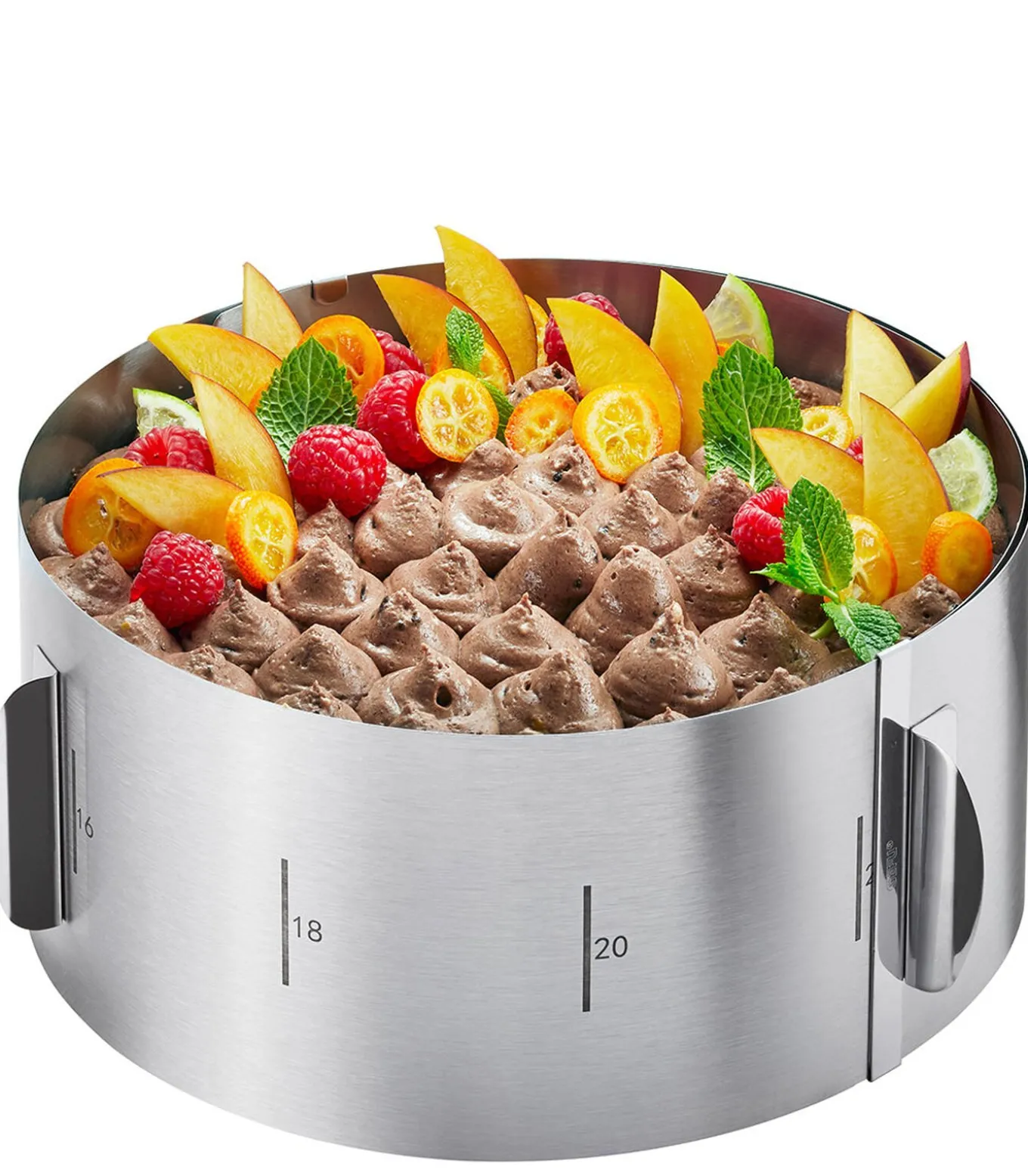De Gefu Kookring Tondo is een multifunctionele tool voor thuisbakkers. De diameter is verstelbaar tussen 16 en 30 cm, waarmee je verschillende soorten taarten en cakes kunt bakken. Er zitten twee handige handvatten aan die ervoor zorgen dat je de diameter precies kan instellen. Na gebruik kan deze roestvrijstalen taartring schoongemaakt worden in de vaatwasser.