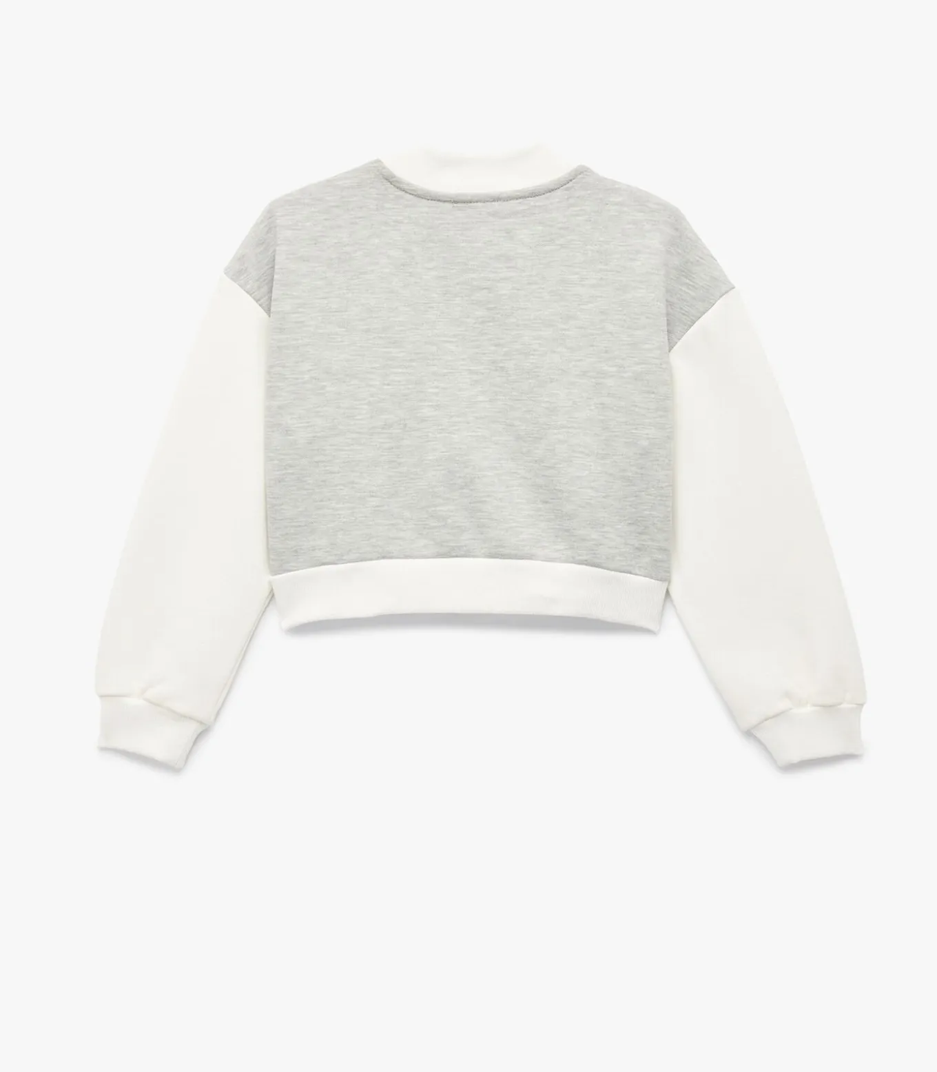Korte varsity jasje met ronde hals, lange mouwen en knopenprint.