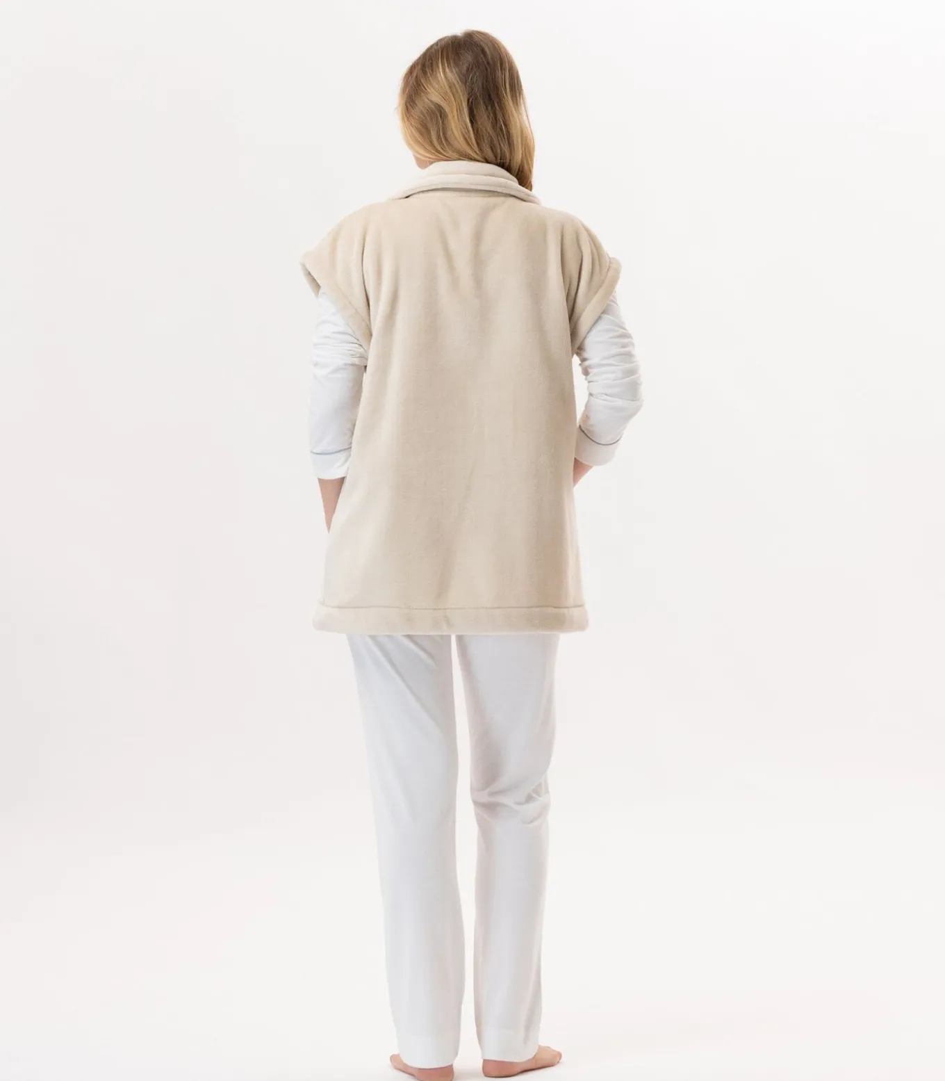 De mouwloze versie van het Essentiel–jasje is een echte ready–to–wear–jas met een maxi–kraag en een dubbele rij knopen. Mouwloos, voegt hij een vleugje warmte toe aan je loungewear, nachtkleding of zelfs je dagoutfits, terwijl hij je bewegingsvrijheid biedt.