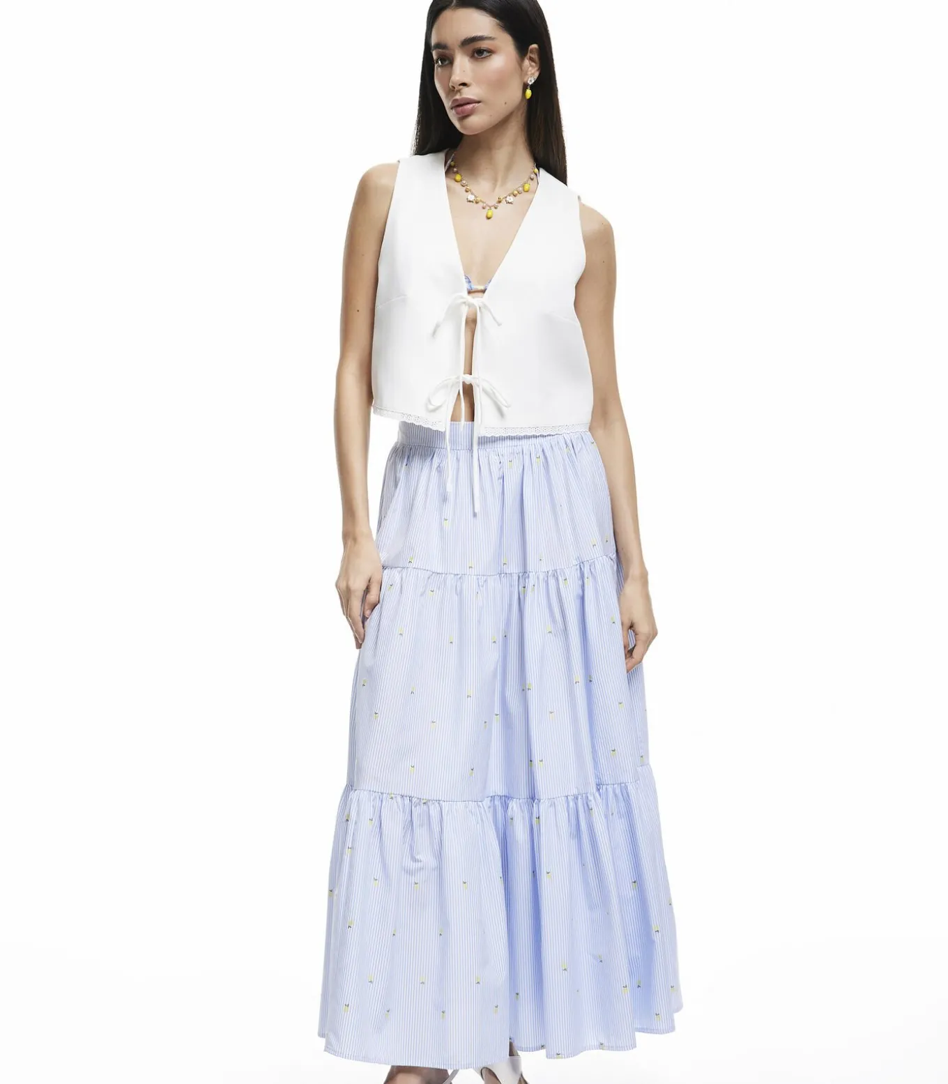 V–neck bow and front tie details linen blend vest