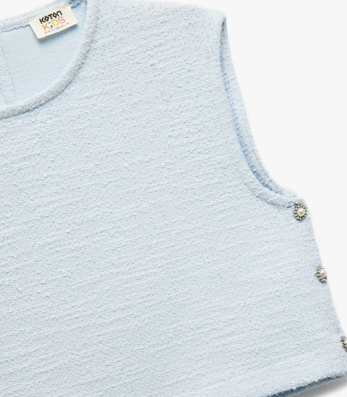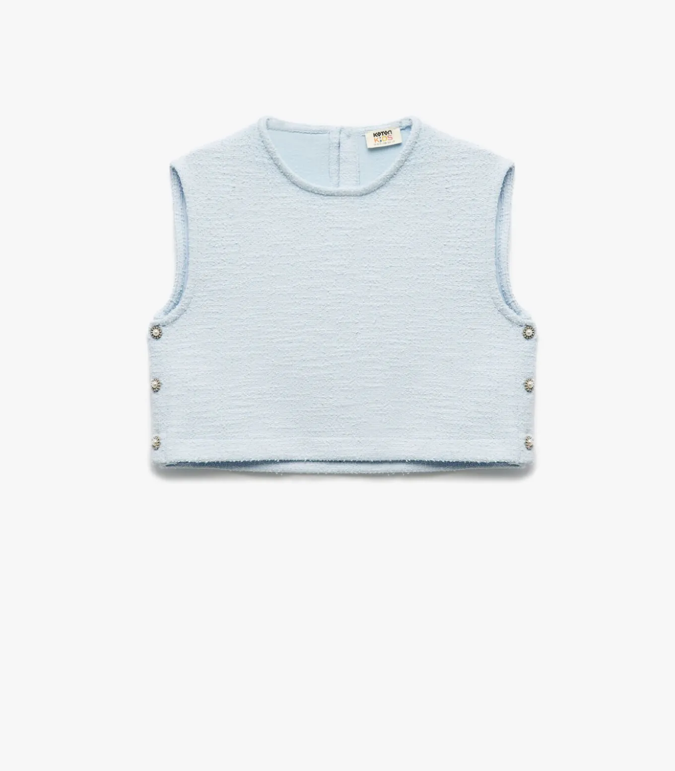 Crew neck sleeveless button detail tweed blouse.