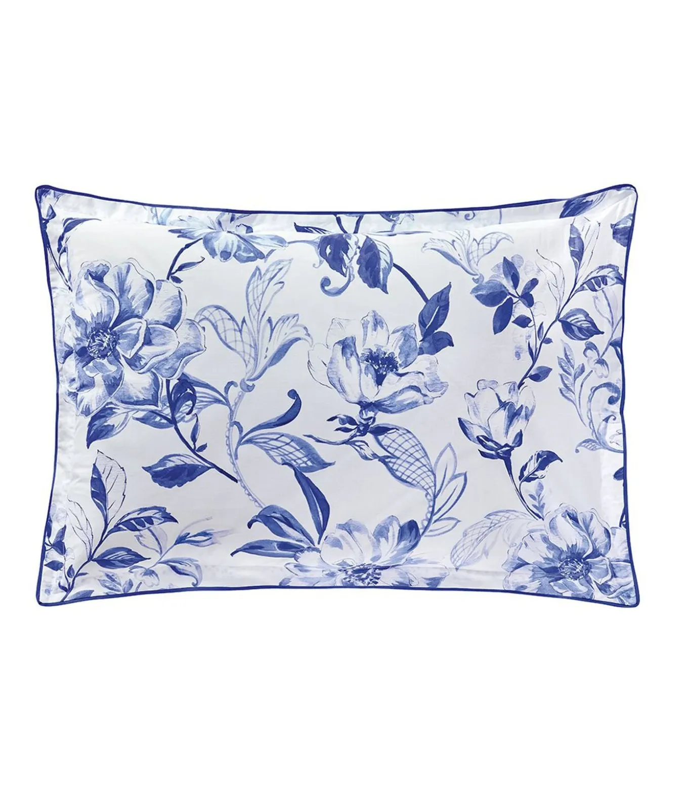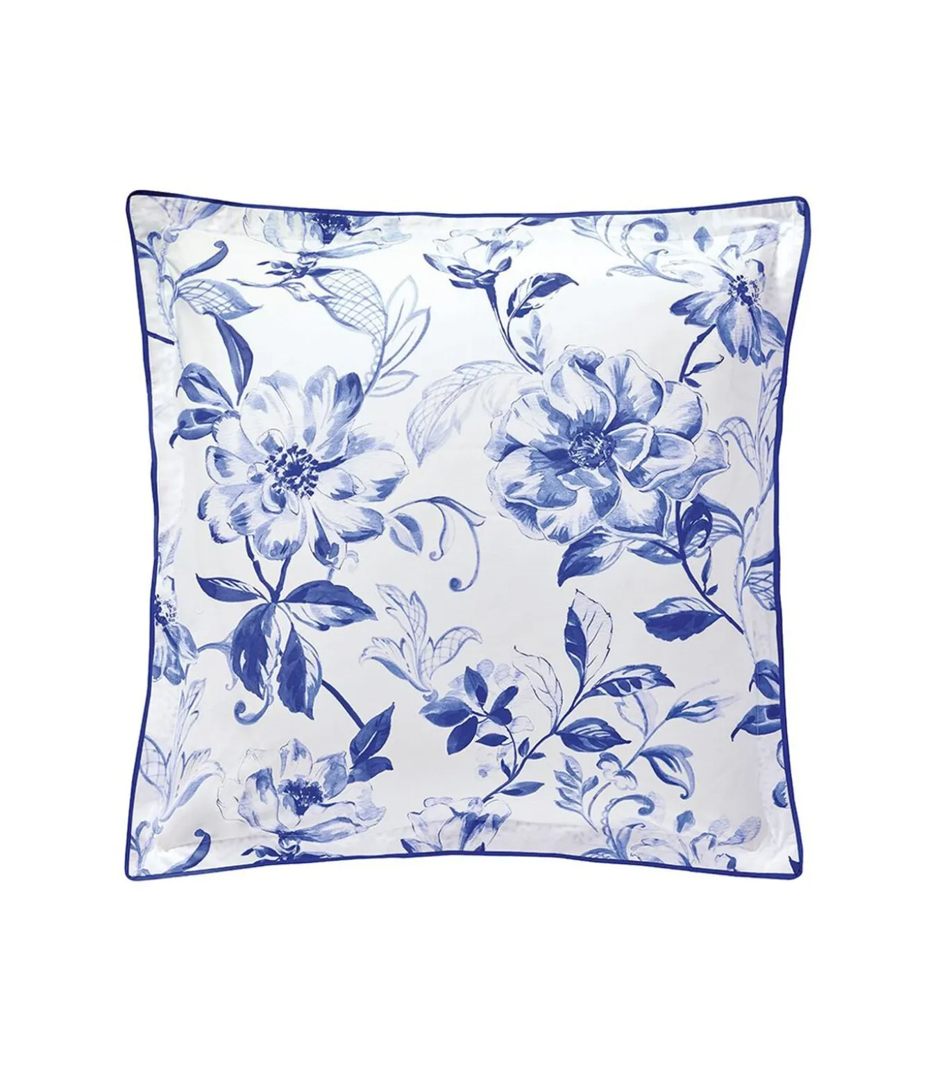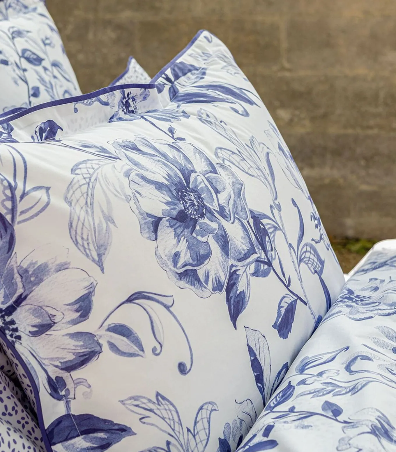 De zacht gebogen acanthusbladeren zijn een poëtisch antwoord op de inktblauwe camelia’s. De kussensloop EGERIE is zowel chique als modern.