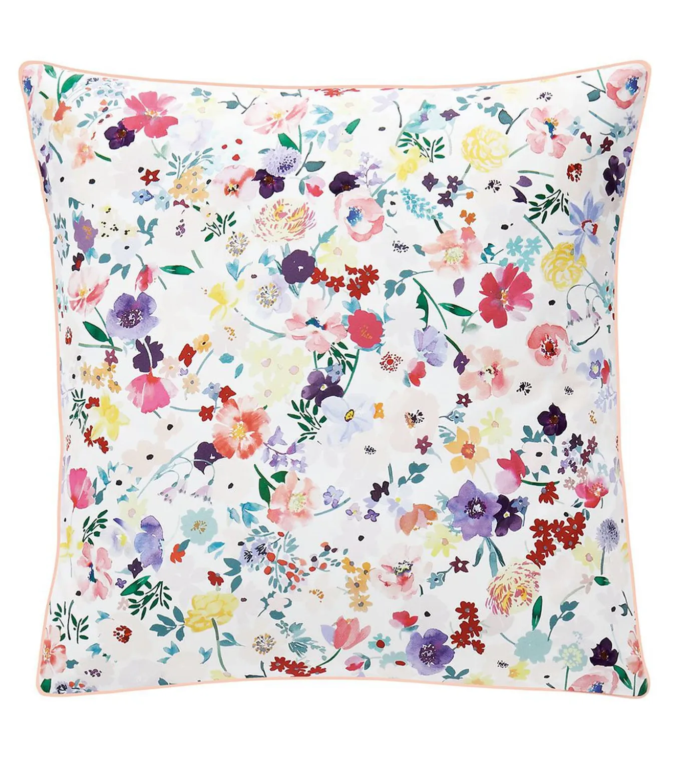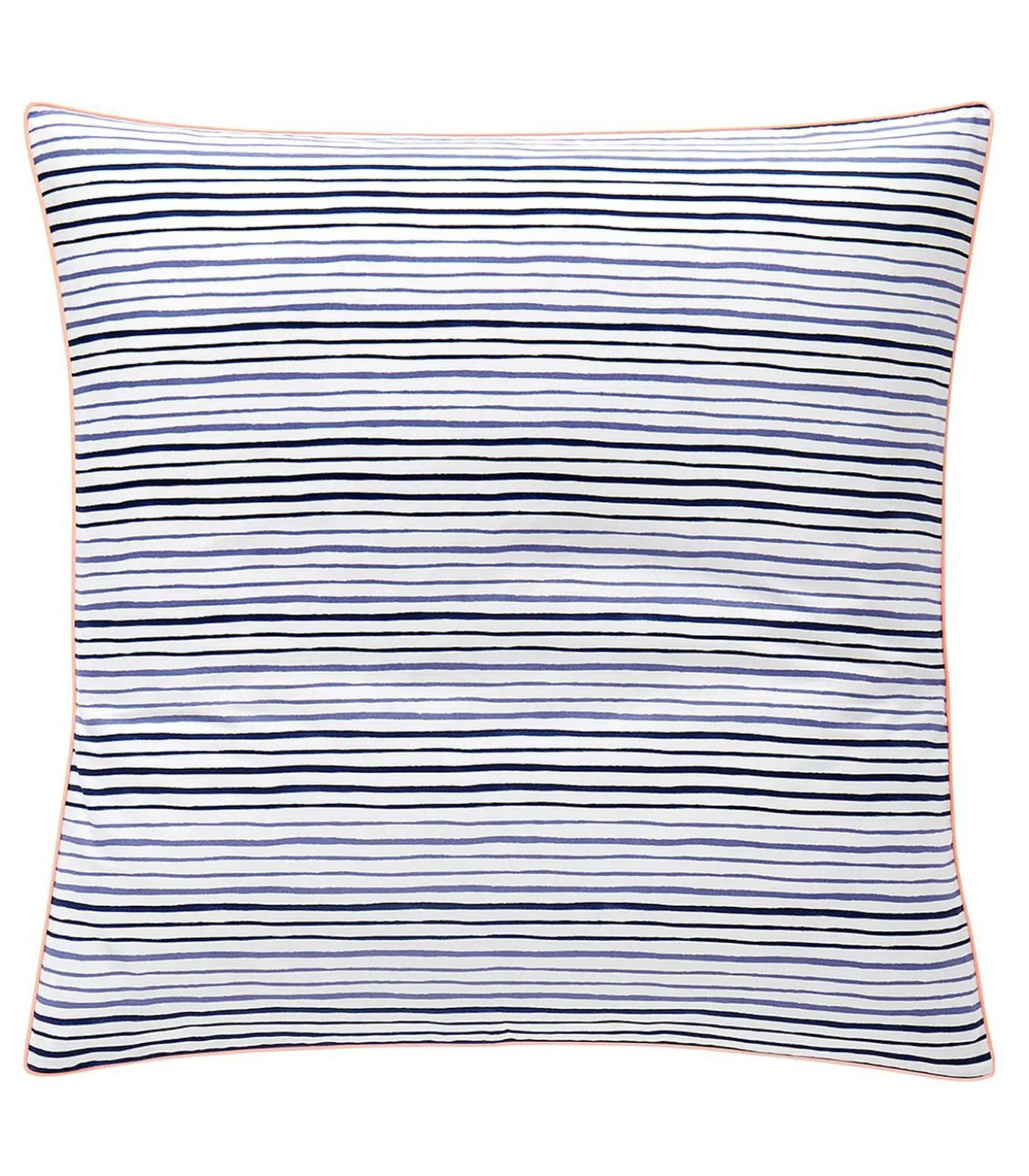Meerkleurige bloemenprintAchterkant met maritieme streepprint.Reversibel kussenhoes met dubbele flapPerzikkleurige biesafwerking