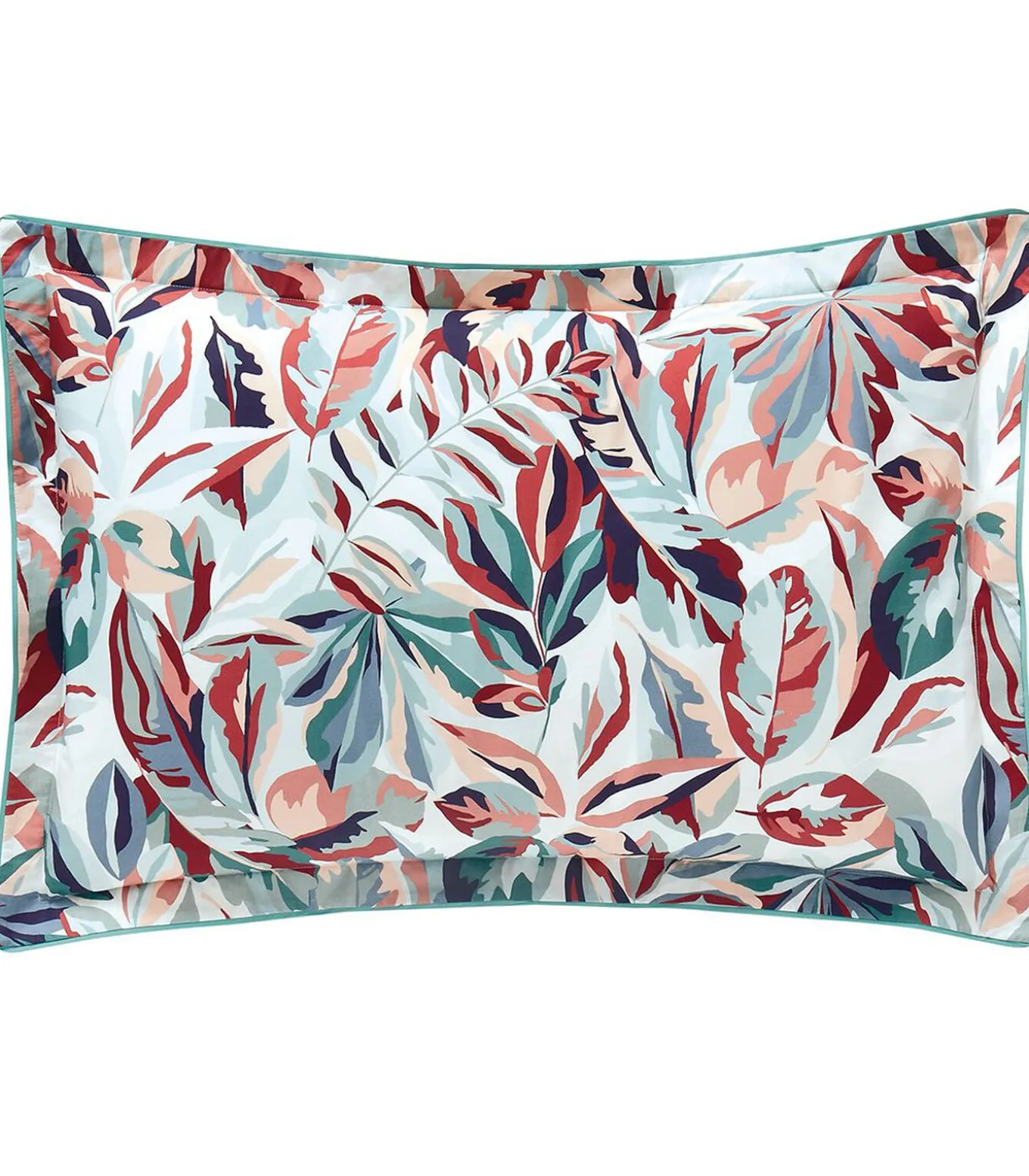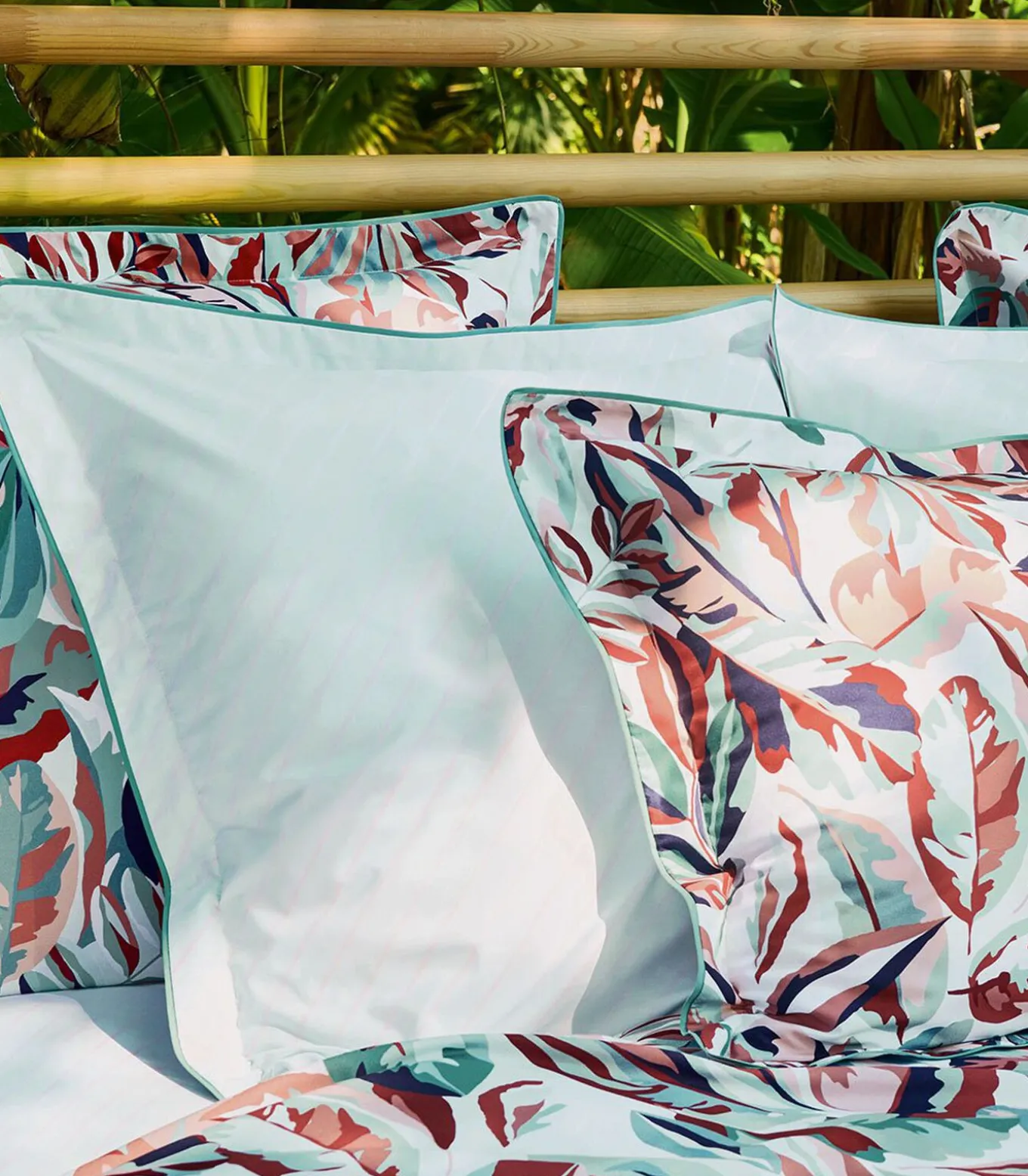 Meerkleurige exotische bladerenprintAchterkant met diagonale streepprint op een lichtgroene achtergrond.Sloop met platte volant van 3,5 cm.Afwerking met groene bies.