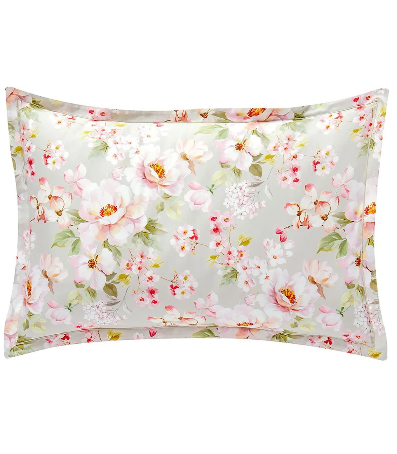 Voorzijde bedrukt met rozen en kersenbloesems op een grègekleurige achtergrond.Achterzijde met palmettenmotief op dezelfde grègetint.Sloop met platte volant van 3 cmAfgewerkt met een fijne grègekleurige bourdonsteek
