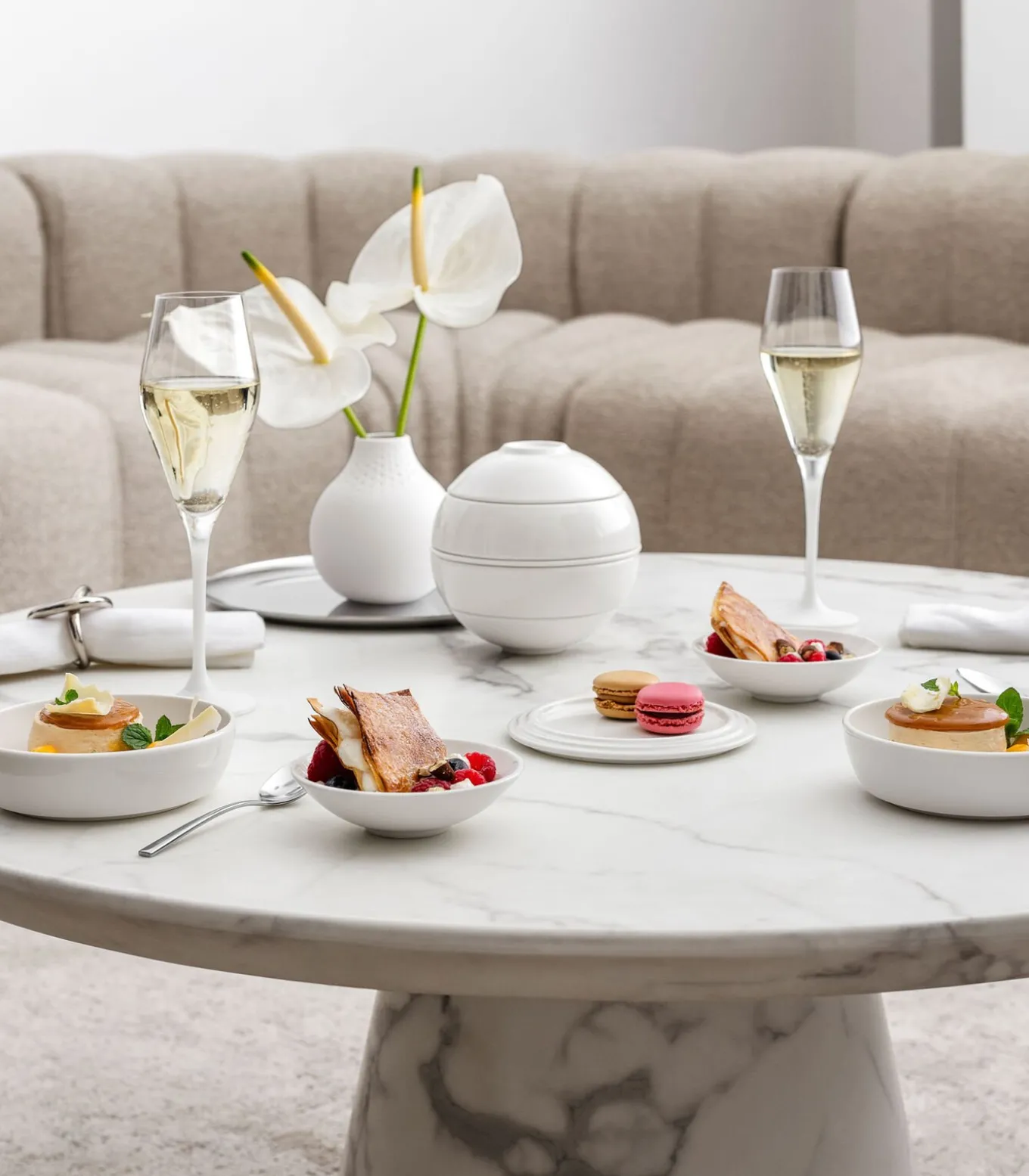 La Boule is een designobject dat al diep geworteld is in het DNA van Villeroy & Boch en combineert de kracht van het merk V&B met keramische knowhow en iconisch design. We zetten het succesverhaal met een “Iconic Family” voort: La petite Boule is de kleinere versie van onze topsellers La Boule memphis, black&white, white and black en Toy’s Delight. Als tegenhanger van La Boule, dat dineren en interieur combineert, combineert de kleine versie snacken en interieur. La petite Boule white is niet alleen een prachtig verzamelobject, maar ook de perfecte keuze voor fijnproevers die op zoek zijn naar een ideaal cadeau voor verschillende gelegenheden. Deze geraffineerde creatie combineert eersteklas functionaliteit met een iconisch ontwerp en trekt niet alleen alle blikken naar zich toe aan de eettafel, maar wordt ook een absoluut highlight in elke stijlvolle inrichting. Het bijzondere aan deze serviesset is de moeiteloze transformatie tot een artistieke bol. Hij bestaat uit vijf onderdelen, vier kommen en een middenbord, en is gemaakt van hoogwaardig porselein in Duitsland. La petite Boule white belichaamt tijdloze elegantie en eersteklas kwaliteit. Verzeker u nu van de innovatieve snackset! Geschikt voor de vaatwasser en magnetron