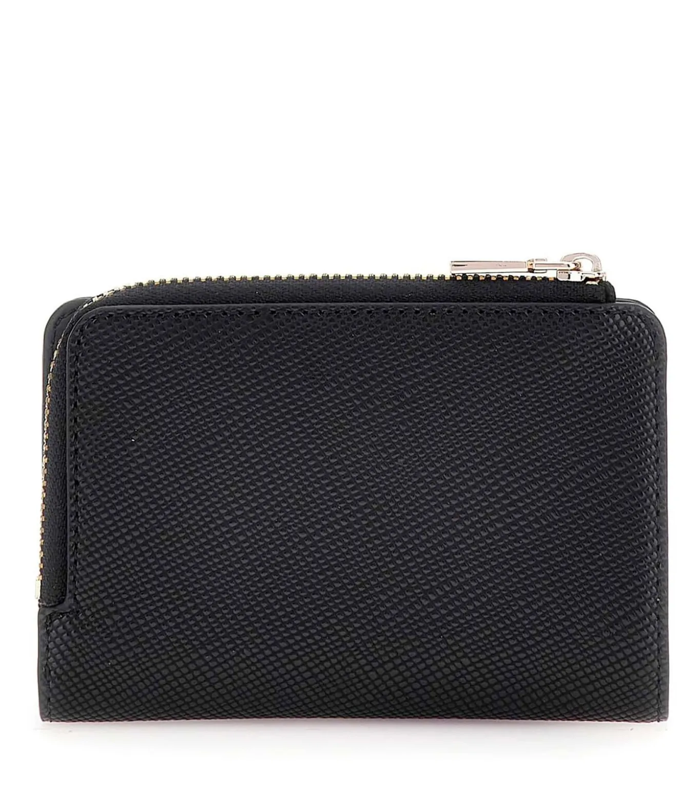 Kleur: Zwart Samenstelling: 100% Polyurethaan Sluiting: Rits Afmetingen: 12 x 8 x 2 cm Details: Saffiano leer, creditcardvak, metalen logo–opschrift op de voorkant, lichtgoudkleurige hardware