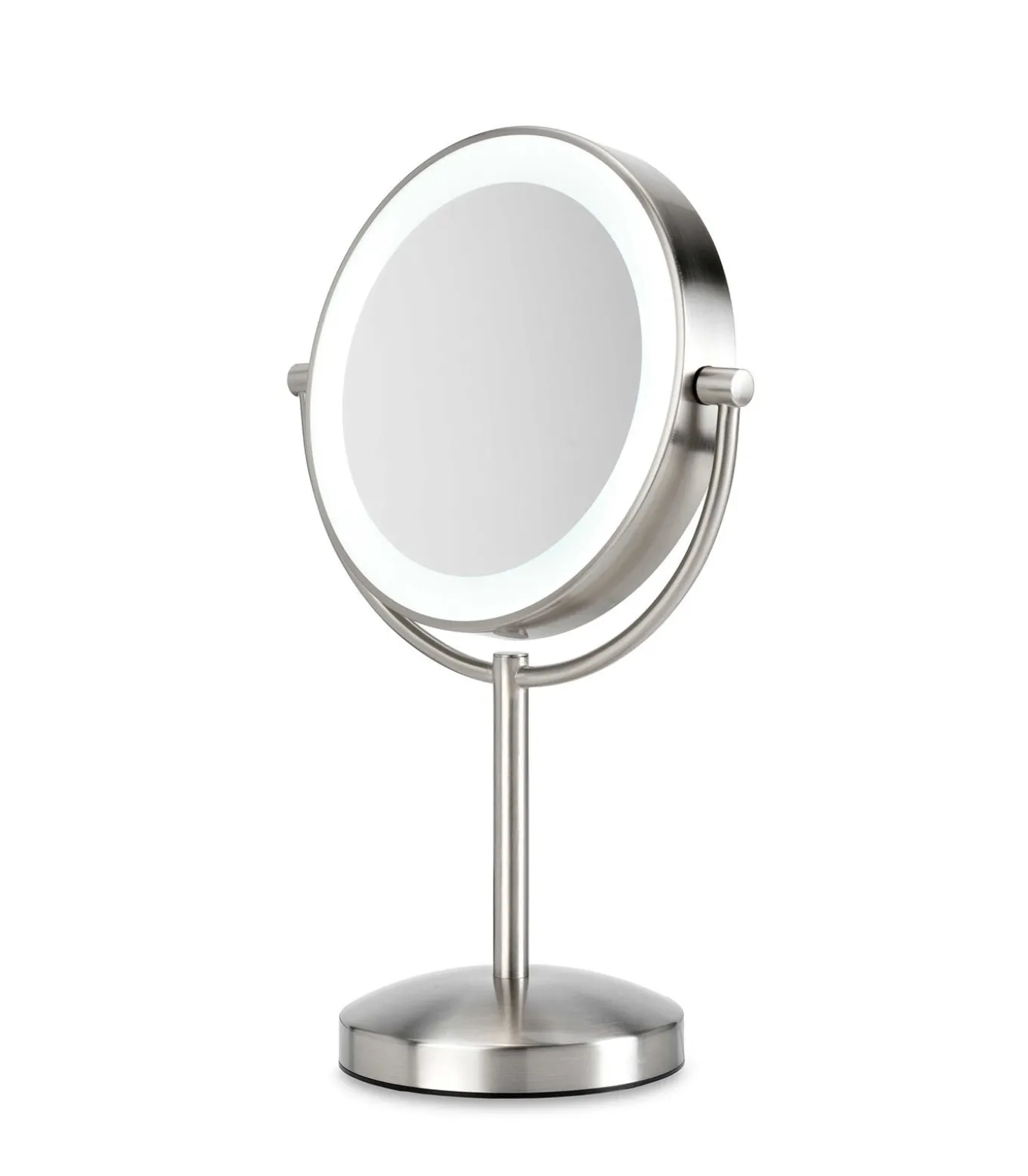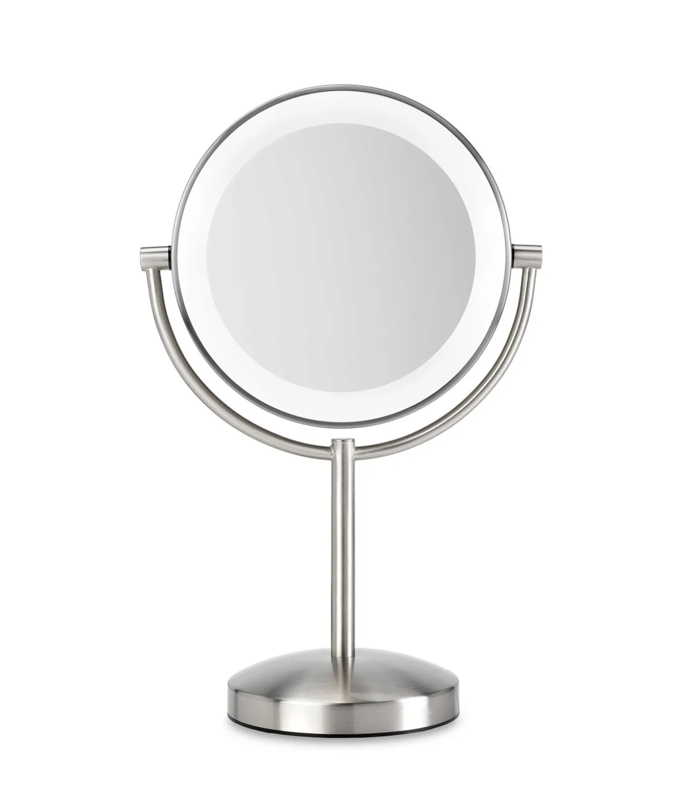 De dubbelzijdige Slimline LED Mirror van BaByliss is een spiegel met duurzame ledlampen voor evenwichtige verlichting rondom, die zorgen voor een kristalheldere reflectie. Wissel eenvoudig tussen de reguliere spiegel aan de ene kant en de 8x vergrotende spiegel aan de andere kant, die geschikt is voor het meer gedetailleerde werk.Kenmerken: – 1x normaal zicht en 8x vergroting– Levenslange LED–surroundverlichting– 1 lichtstand– Uitvoering in geborsteld nikkel– Aan/uit schakelaar– 2,7m snoer– 2 jaar garantie