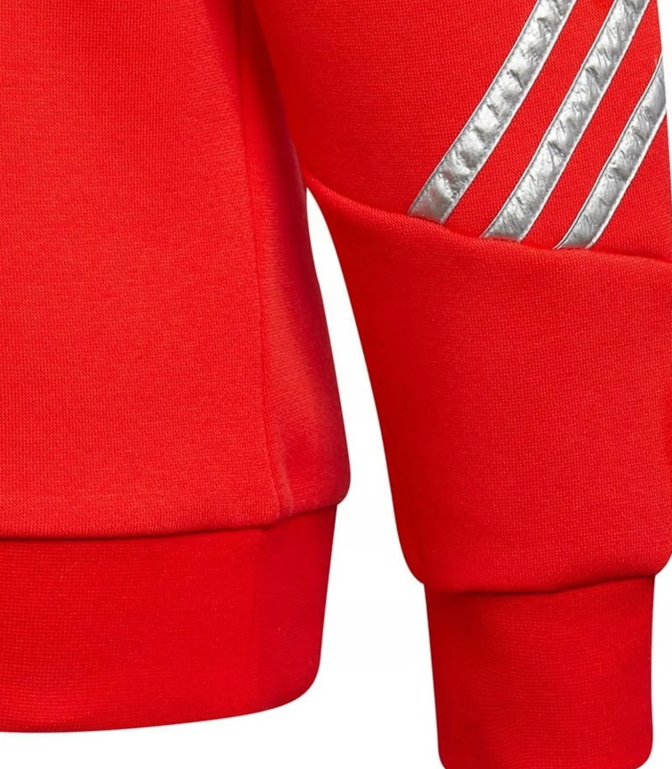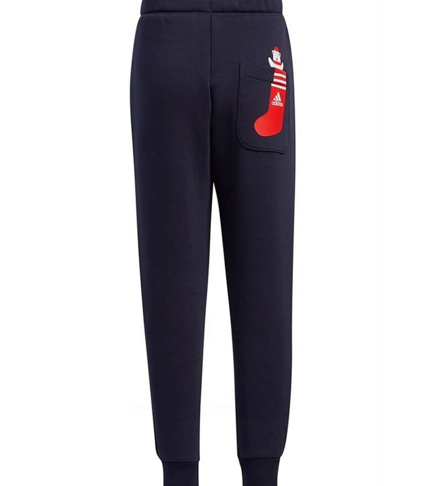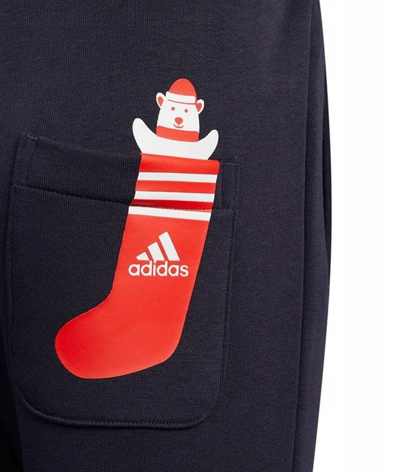 Adidas Trainingset met logo in donkerrood, bestaande uit een broekje en een sweater. Het trainingset is gemaakt van 70% katoen en 30% polyester, waarbij de stof zacht aanraking biedt. De ontwerpen bevatten logo’s, ijsberen, sneeuw, sokken en streepdetails. Het trainingset beschikt over twee zijzakken en heeft een crew neck hals. Het zoom is gerimpeld, de waaierlijn is elastiek en het type mouw is met lange mouwen. Het kan als pull–over of pull–on gedragen worden. Deze set maakt deel uit van de kerstmis collectie.