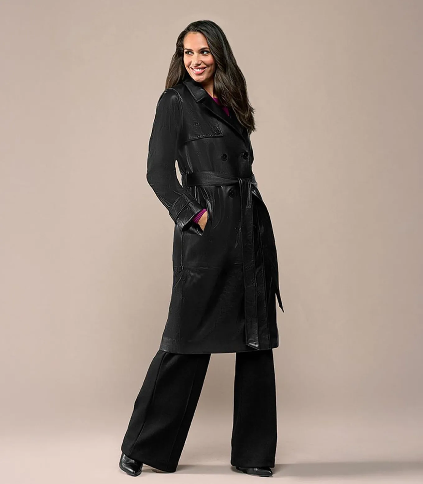 Met een leren trenchcoat ben je verzekerd van een stijlvol item dat het hele jaar door van pas komt. Deze zwarte variant is vervaardigd uit soepel, hoogwaardig leer dat zacht aanvoelt en prachtig valt. Het klassieke ontwerp, met reverskraag, dubbele knoopsluiting en comfortabele steekzakken, straalt elegantie en structuur uit. De rechte pasvorm kan met de strikceintuur eenvoudig worden geaccentueerd voor een vrouwelijke look. De lengte tot op de kuit maakt de jas zowel modern als tijdloos, terwijl het duurzame leer voor een luxe uitstraling zorgt. Combineer hem formeel met de Amira–blouse en de zwarte Torya–broek, of ga voor een eigentijdse twist met de Caylee–printblouse en de Torya in dark berry. De zwarte Lyana trenchcoat is een veelzijdig statementstuk voor iedere garderobe.