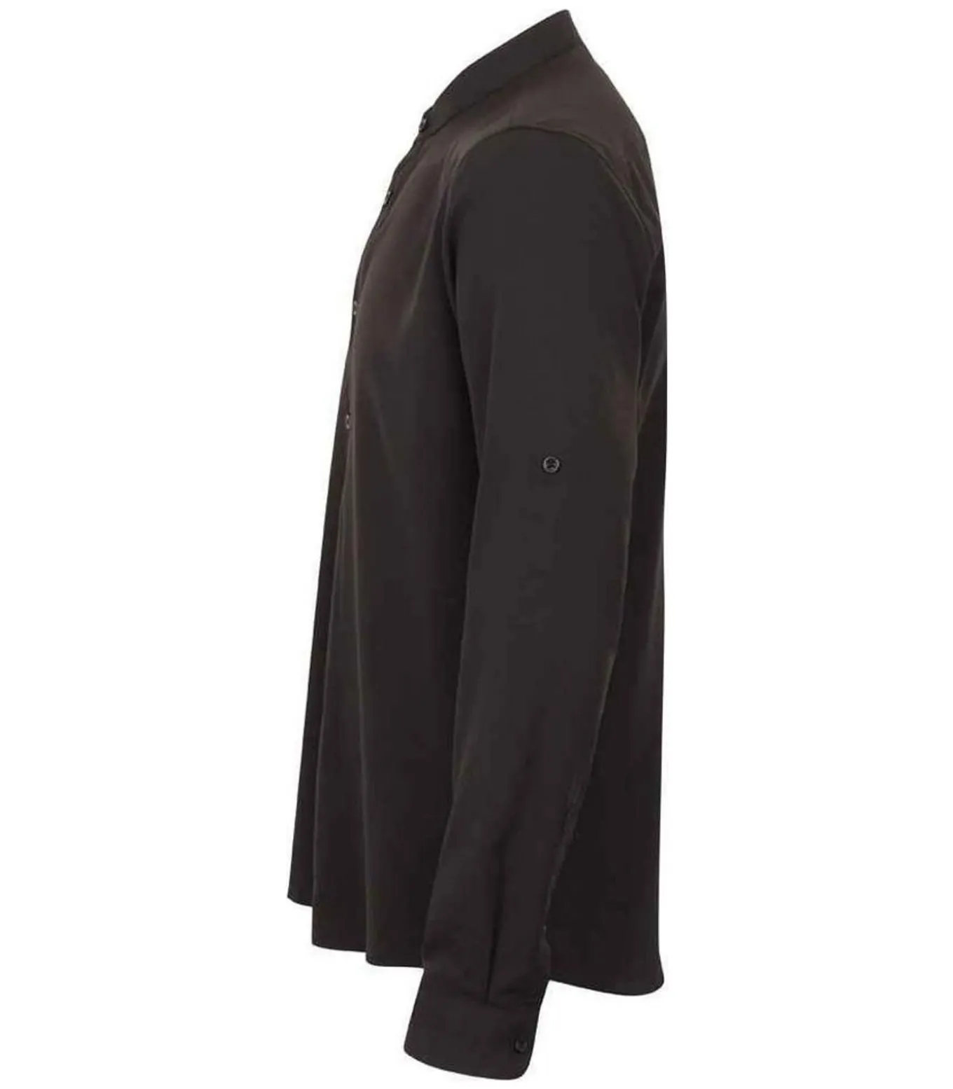 Henbury’s Mandarijn Collar Zwarte Shirt is gemaakt van 100% polyester. Het ontwerp is eenvoudig, met een verstelbare dubbele knoop en handschoenmanchet, een knoopsluitende sluiting en gebogen heem. De mouwen zijn met lange mouwen en rolmouw uitgevoerd. De halslijn is een mandarijnkraag. De stoftechnologie bevat anti–bacterieel, kleurecht, vochtafweerend en sneldrogend. Het achterjuk, het uitgesneden etiket, de DTM–knoppen, easy–care, afteerbaar etiket en toon–op–toon–knop zijn ook onderdeel van dit shirt. Het heeft een zonnescherm met UPF 50+. Dit shirt is geschikt voor regelmatig gebruik en heeft een gewicht van 115gsm. Het wordt gecertificeerd door Amfori, BSCI, Sedex en WRAP. De grootte–indicaties zijn: S (38 in.), M (40 in.), L (42 in.), XL (46 in.) en XXL (48 in.).