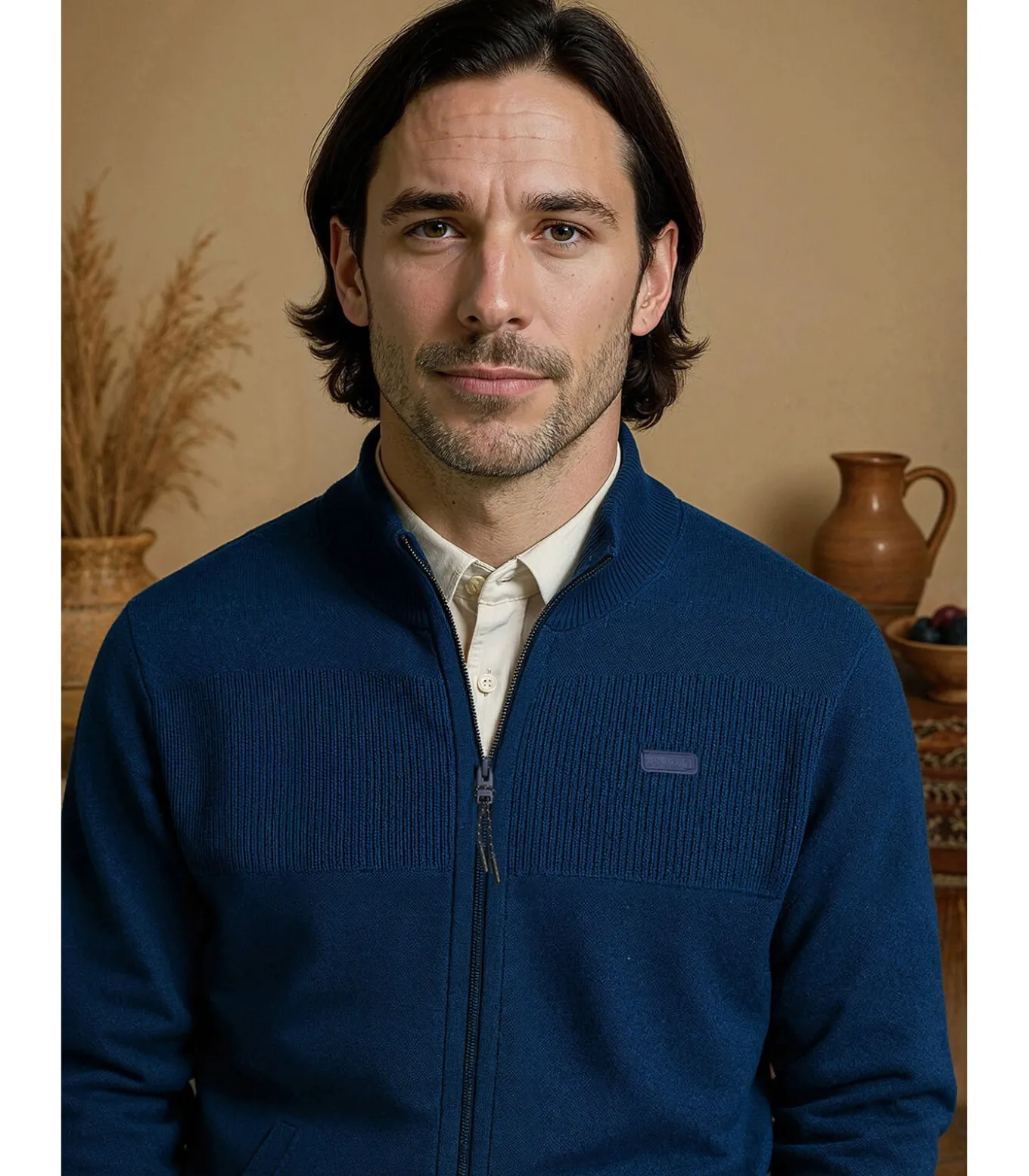 Ga voor een casual en trendy look met deze marineblauwe herentrui met rits, geïnspireerd op het Laguna Parón–thema. Gemaakt van 45% nylon, 30% acryl, 20% viscose en 5% kasjmier, biedt deze trui zowel warmte als comfort. De rechte snit, hoge kraag en elastische geribbelde boorden voegen een vleugje moderne stijl toe. De ritssluiting met contrasterende afwerkingen en kangoeroezakken aan de voorkant geven deze trui een praktische en originele look. De lange mouwen en elastische geribbelde manchetten geven dit kledingstuk een nette afwerking. Het uitgewiste J&JOY–logo op het hart en de contrasterende binnenkant van de kraag voegen een vleugje branding en authenticiteit toe. Bestel nu en voeg een must–have toe aan je wintergarderobe.