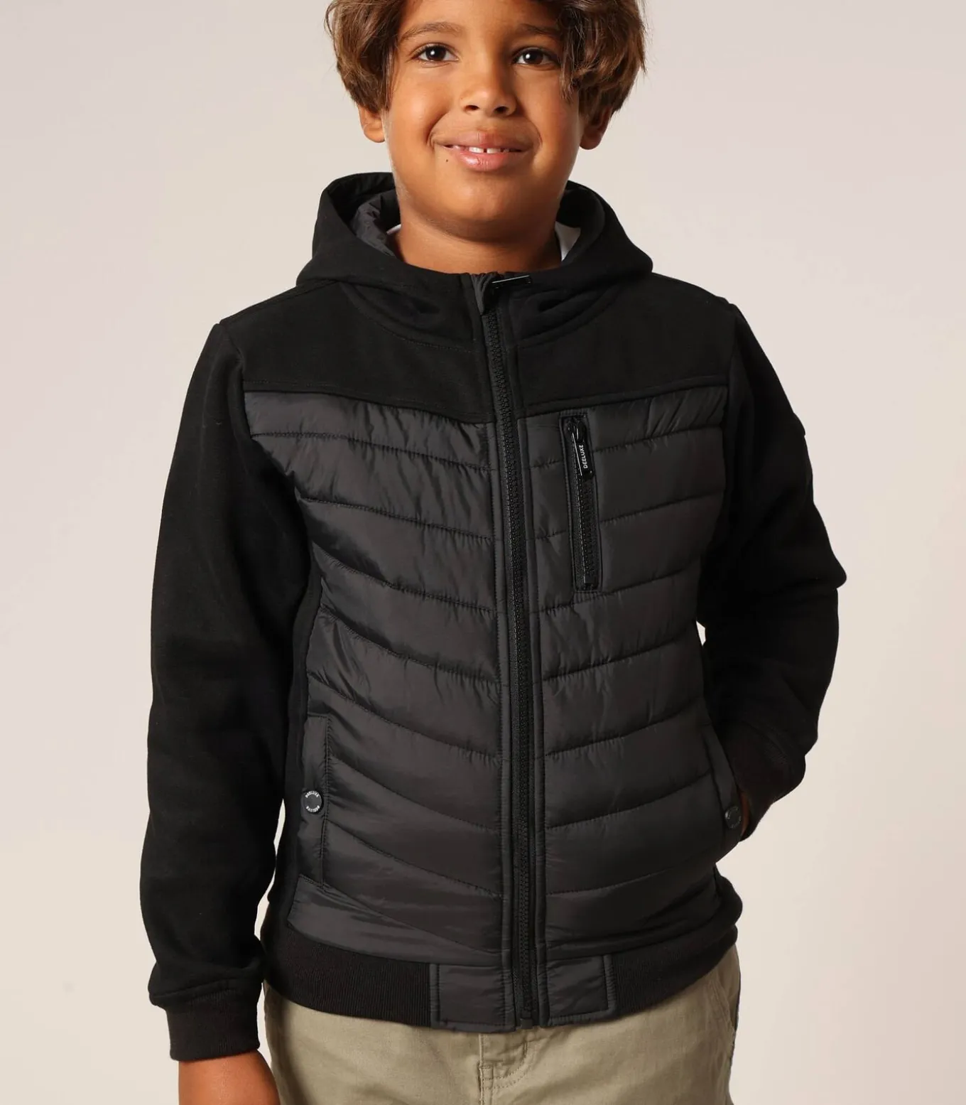 MARSHAWN casual jongensjas. Deze jas met rits heeft een gewatteerde voorkant met donseffect en mesh mouwen voor een lichtgewicht sweatshirt–mix–sweater–look. Met een capuchon met trekkoord en geribbelde manchetten biedt hij comfort en bescherming. Hij heeft twee borstzakken met rits, twee zijzakken met drukknopen en een ronde badge op de mouw. Een praktische essential voor het tussenseizoen.
