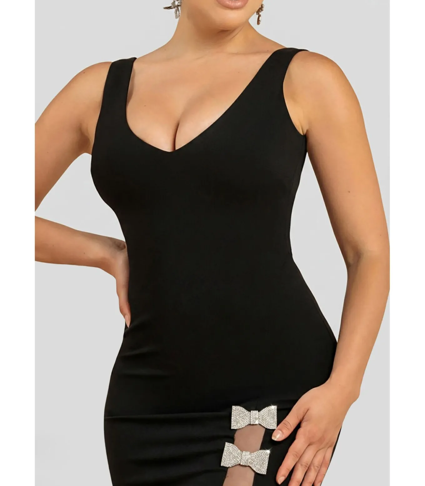 Trek alle ogen naar je toe met de prachtige Goddiva Diamante Broche Thigh Split Mermaid Maxi Dress in zwart. Deze glamoureuze jurk heeft een gewaagde split aan de voorkant versierd met fonkelende diamanten strikken die het licht vangen bij elke stap. Het mouwloze ontwerp en de V–halslijn creëren een modern, elegant silhouet, terwijl de aansluitende pasvorm het figuur perfect benadrukt. De zeemeermin–zoom voegt een dramatisch accent toe en ontvouwt zich elegant voor een verbluffende look. In klassiek zwart is deze jurk een echte showstopper, met de perfecte balans van verfijning en verleiding om elke speciale gelegenheid onvergetelijk te maken. Sommige kledingstukken bevatten decoratieve broches met spelden. Wees voorzichtig om letsel te voorkomen. Belangrijke opmerkingen: Controleer spelden voor het dragen, houd uit de buurt van kinderen en huisdieren, wees voorzichtig bij het aan– en uitkleden. U bevestigt deze veiligheidsmaatregelen bij uw aankoop.