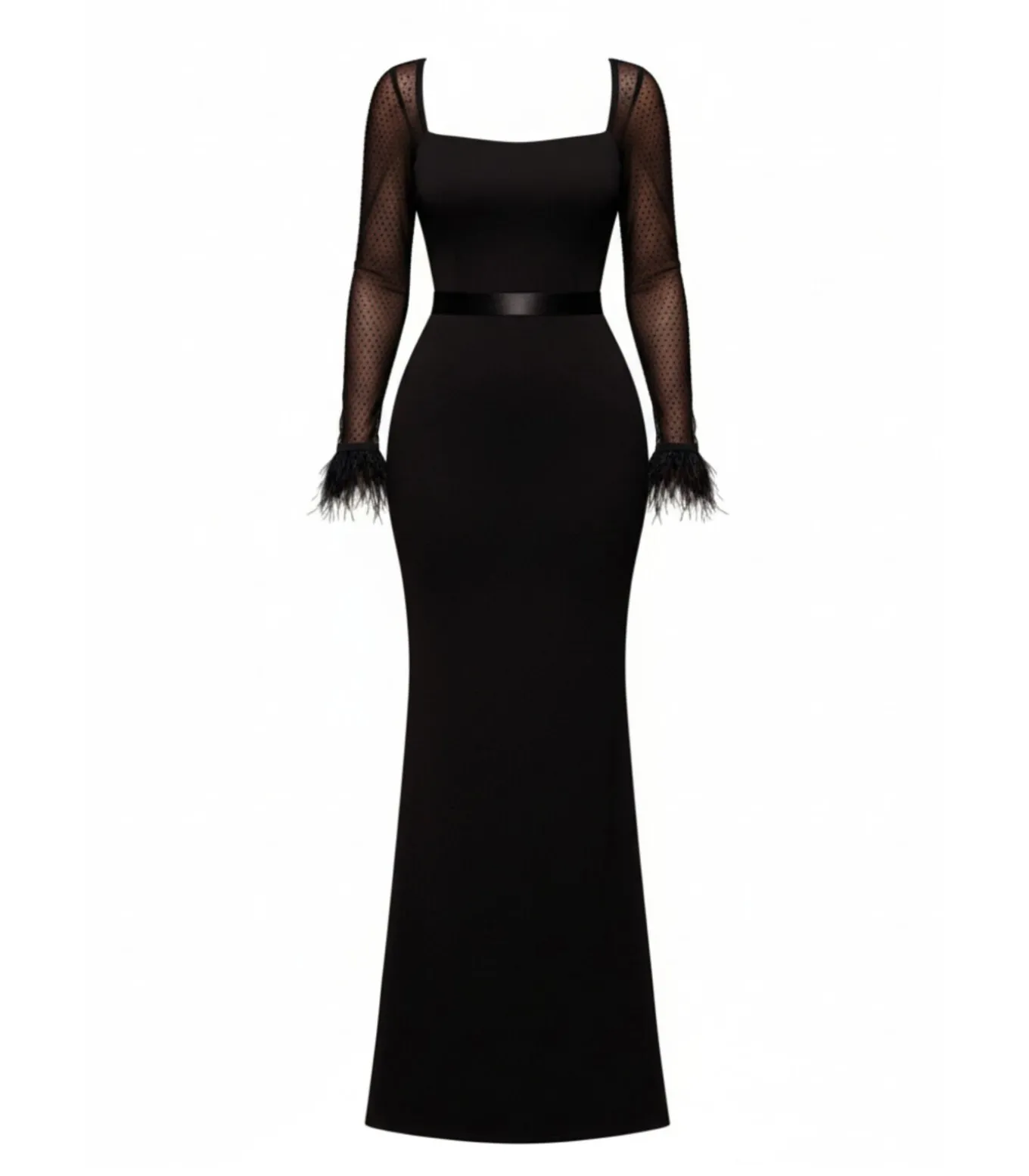 Een echte blikvanger voor onvergetelijke avonden – de Goddiva Dobby Mesh Feather Sleeve Evening Maxi Dress in zwart belichaamt pure elegantie met een verleidelijke touch. Met een flatterende vierkante halslijn en aansluitende pasvorm creëert de jurk een perfect silhouet en straalt hij moeiteloze glamour uit. De lange, transparante mouwen van mesh hebben een delicaat stippenpatroon en zijn versierd met dramatische veren die een speelse, luxueuze touch aan de look geven. Een slanke satijnen tailleband benadrukt de taille en valt in een sensuele zeemeermin zoom voor een rode loper waardige afwerking. De tijdloze zwarte kleur maakt de jurk veelzijdig voor black–tie evenementen, glamoureuze afspraakjes of elegante avonden met een dresscode. Met zijn luxueuze uitstraling en betaalbare prijs is deze limited edition jurk elke keer weer verleidelijk. Een jurk die één keer gedragen kan worden en steeds opnieuw gestyled kan worden voor speciale gelegenheden – moderne avondkleding met een onmiskenbaar vrouwelijke touch.