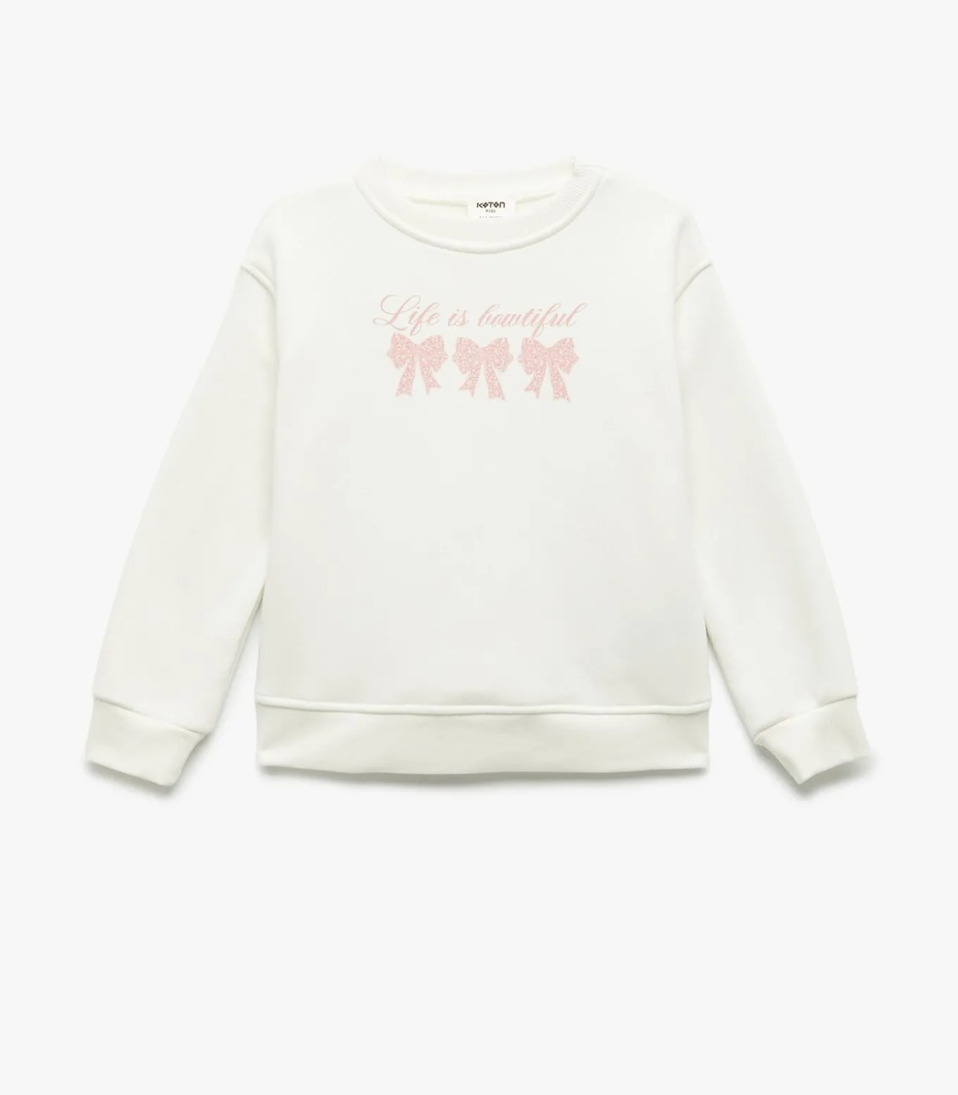 Ontdek dit charmante meisjes sweatshirt met lange mouwen en een ronde hals, voorzien van een schattige strikprint. Gemaakt van zacht en comfortabel katoen, biedt dit kledingstuk de hele dag door draaggemak. Perfect te combineren met een broek of rok voor een casual, schattige look.